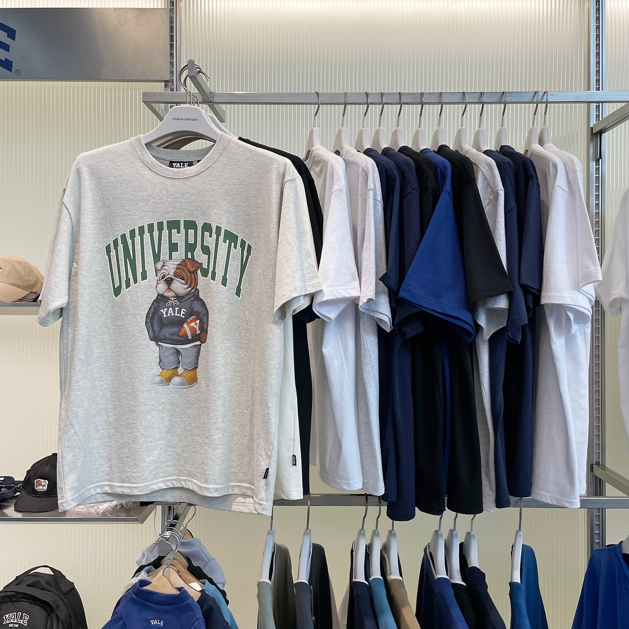 가장 눈에 들어왔던, 그리고 구매욕을 자극했던 티셔츠. 댄 캐릭터를 전면에 내세운 예일의 깔끔한 티셔츠. 어느 스타일이나 캐주얼에 잘 매치하면 입기 좋은 아이템. 대체로 편하게 입으면서도 포인트를 줄 수 있는 베이직한 아이템으로 구성되어 있었다.
