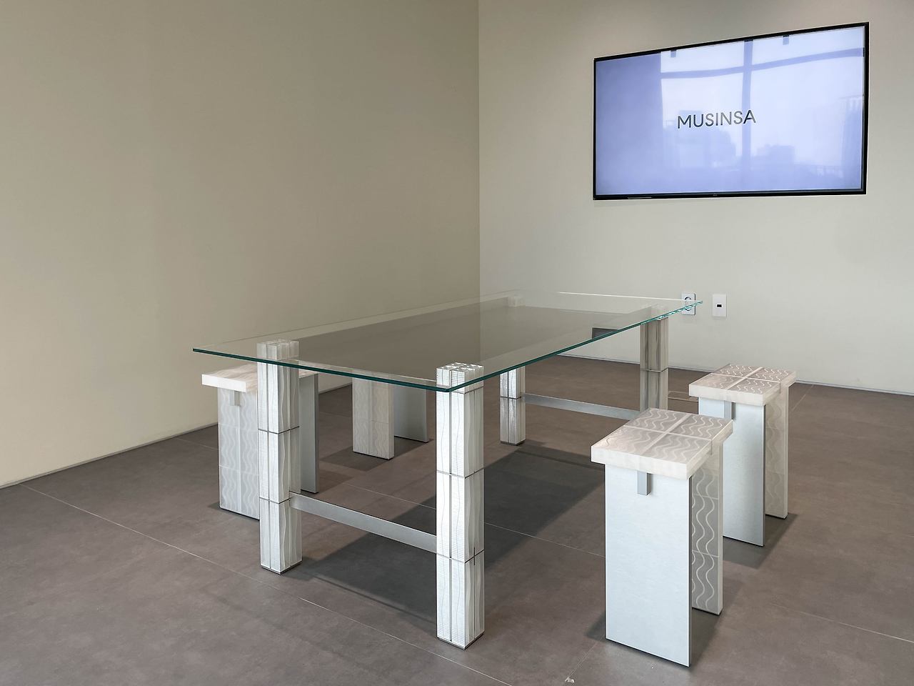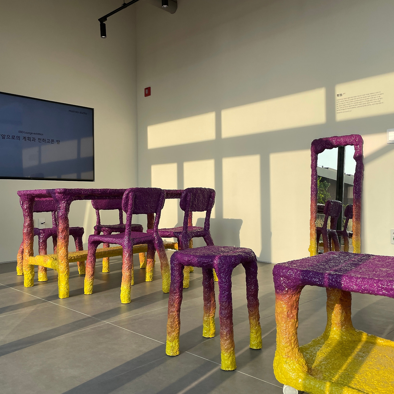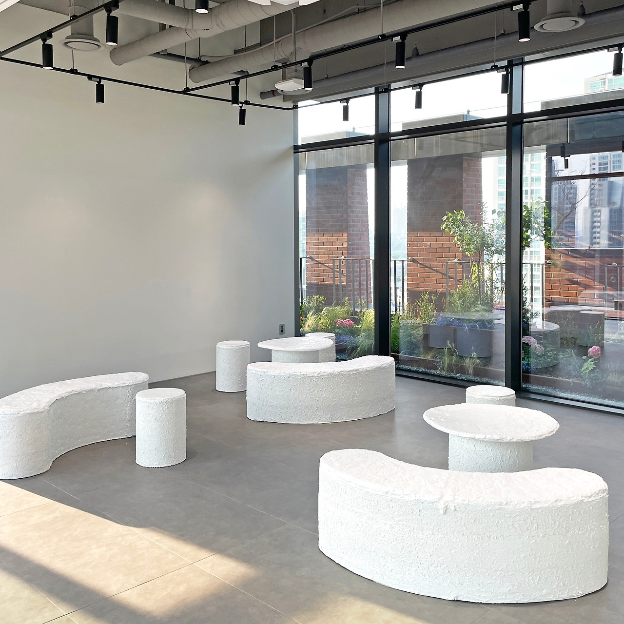 김하늘 작가는 버려지는 것들에 집중한다고 한다. 특히 팬데믹 시대에 수없이 버려지는 폐마스크를 사용해 보고자 했다. 마스크 공장에서 버려지는 자투리 원단 폐기물을 열처리하여 다양한 형태의 가구를 만들고 있다. 번 전시에서는 테이블과 의자를 만나볼 수 있었다. 얼마 전 진행했던 록시땅 STAY 2.0에서도 김하늘 작가의 작품을 만났던 터라 반갑기도 한 작품. 어딜 가나 ESG가 화두인가 보다. 그중에서도 사람들에게 친숙한 마스크를 활용한다는 점이 사람들을 큰 공감을 사지 않았을까?
