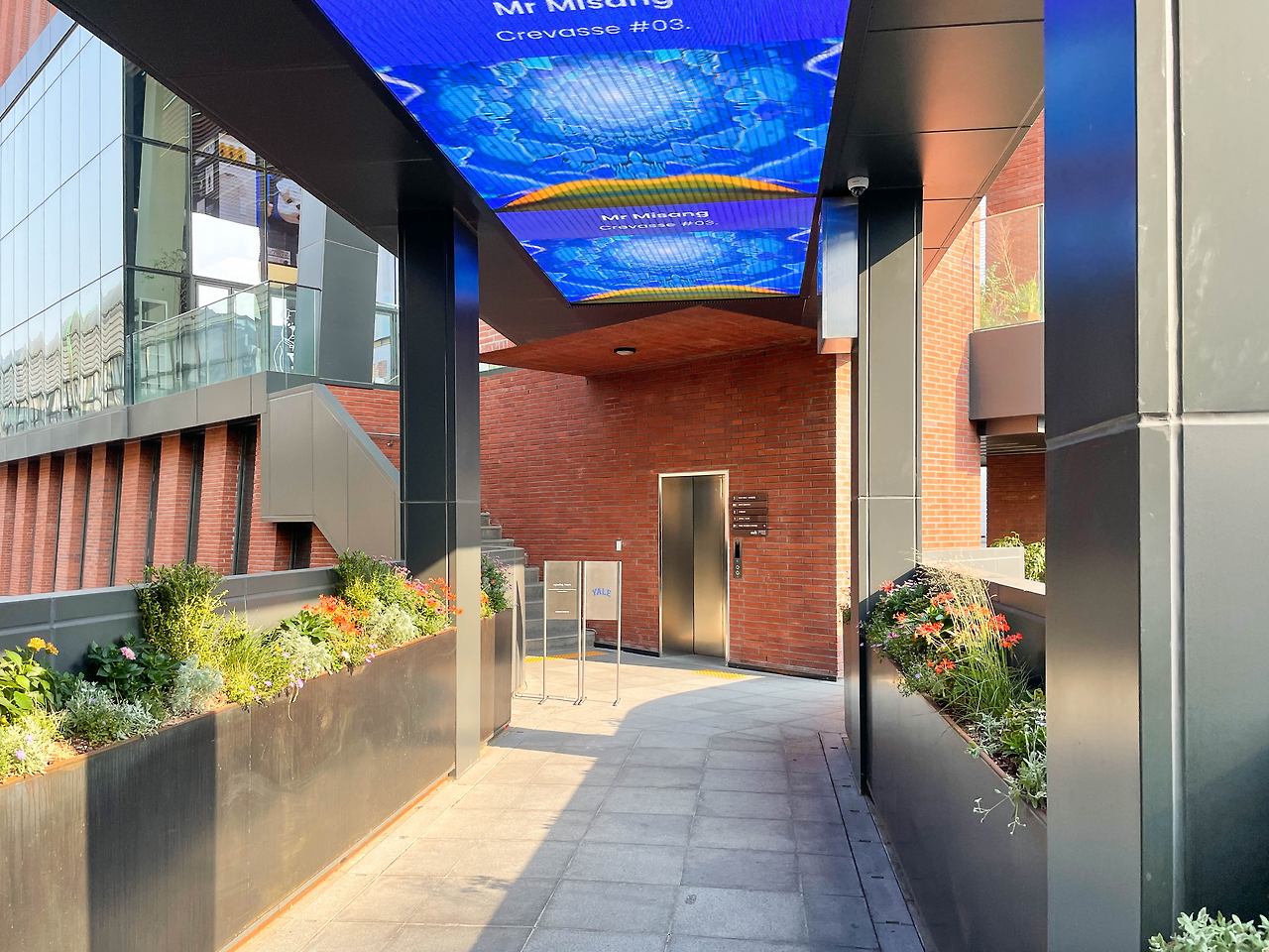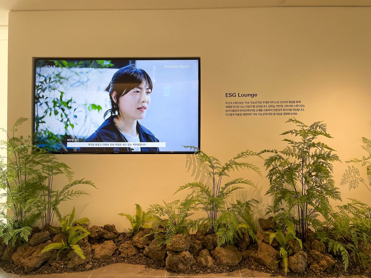 무신사 스튜디오 9층에 가면 볼 수 있는 ESG 라운지. 들어서자마자 전시 소개 공간이 나타난다. 연이어 3개의 방에서 작가의 작품들을 만나볼 수 있다. 스크린을 통해 작가들의 작품에 대한 설명이 담긴 인터뷰가 재생 중이다.