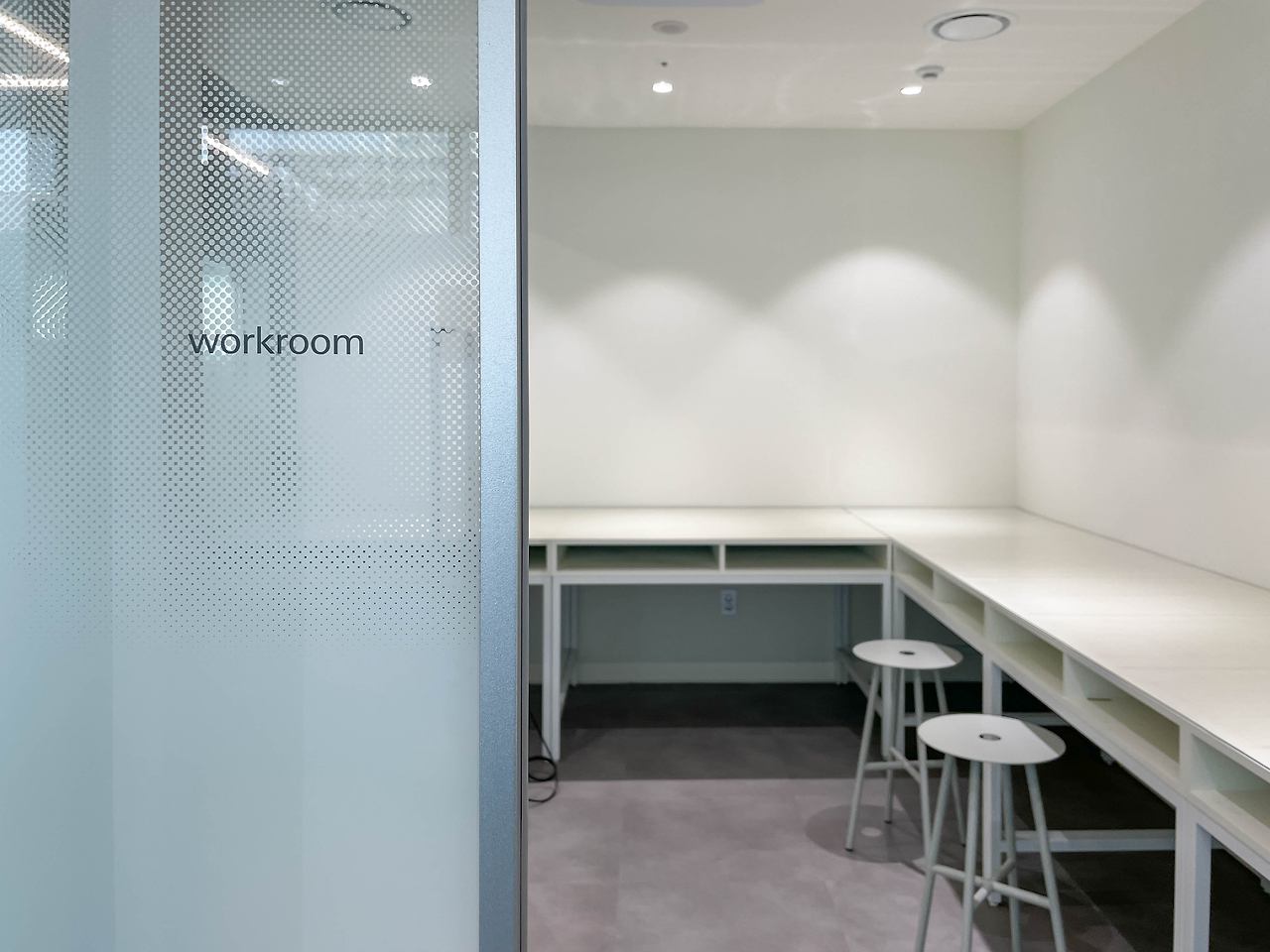 앞에서 말했듯이 무신사 스튜디오는 패션 기업들이 더 일을 잘하고, 효과적으로 집중할 수 있도록 여러 시설들을 제공하고 있다. 대표적인 공간 중에 하나인 work room. 일반 사무실과는 다르게 벽을 따라 길게 테이블이 놓여 있는 걸 확인할 수 있는데, 이곳에서 다양한 작업이 가능하다. 배송을 위한 포장을 하기도 하고, 패턴을 위한 디자인 작업을 하기도 하고. 스팀다리미도 있어서 옷을 정리할 수도 있다.