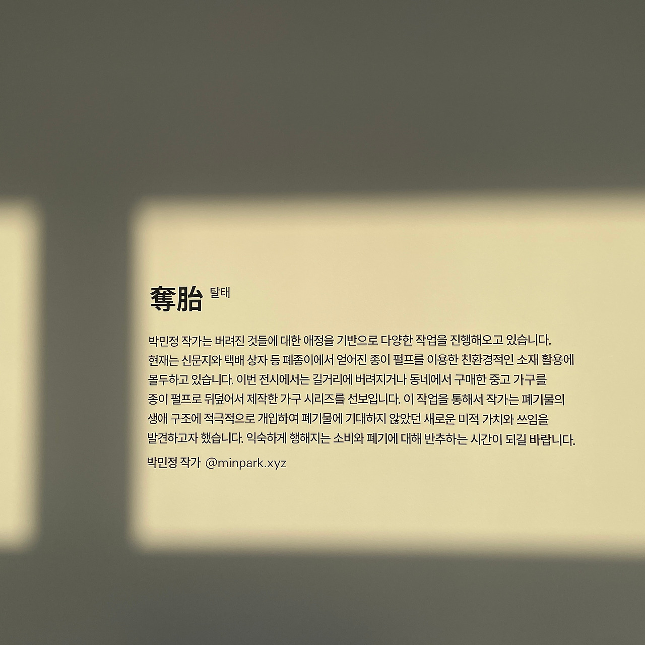 앞선 작품들과는 다르게 화려한 컬러들이 눈에 먼저 띈다. 박민정 작가는 버려지는 것들 특히 폐종이를 활용하여 작품들을 만들어오고 있다. 이번 전시에서는 버려진 중고 가구에 종이 펄프를 덧대어 만든 작품이라고 한다. 완벽히 새로운 컬러와 질감으로 다시 태어난 작품들이 인상적이다.