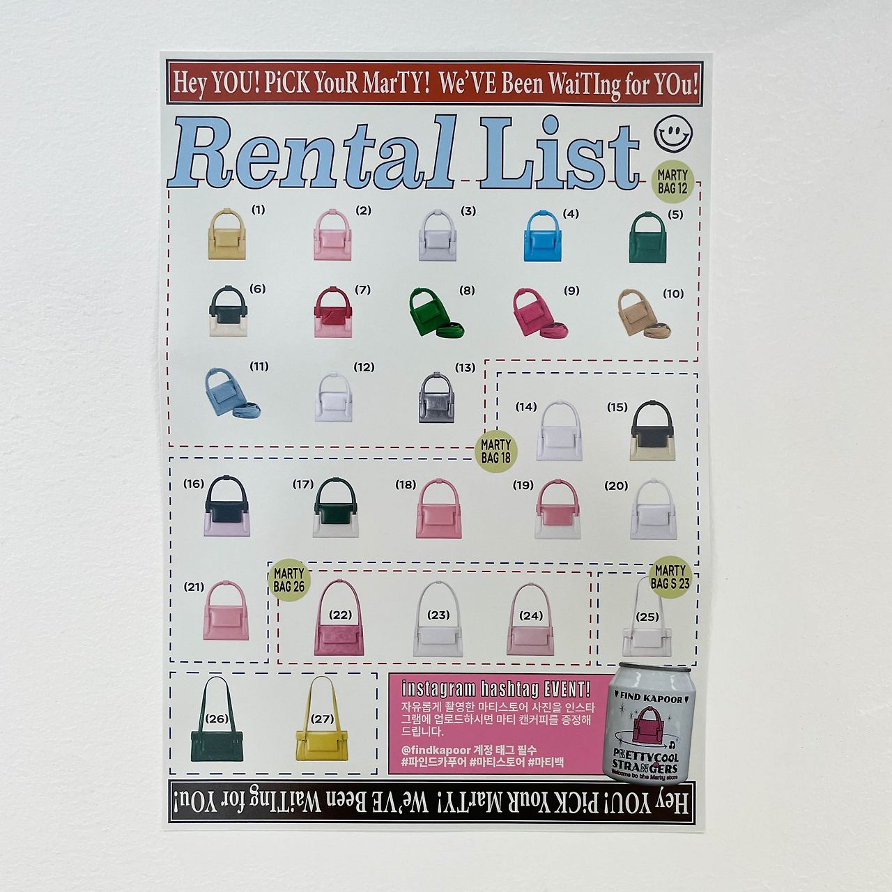 비디오를 빌리듯 가방을 빌린다? 파인드카푸어가 90년대 비디오 렌탈샵을 컨셉으로 MARTY STRORE 라는 팝업스토어를 오픈했다. 외관부터 뉴트로한 감성이 묻어나는 이곳. 정말 가방을 빌려준다고?