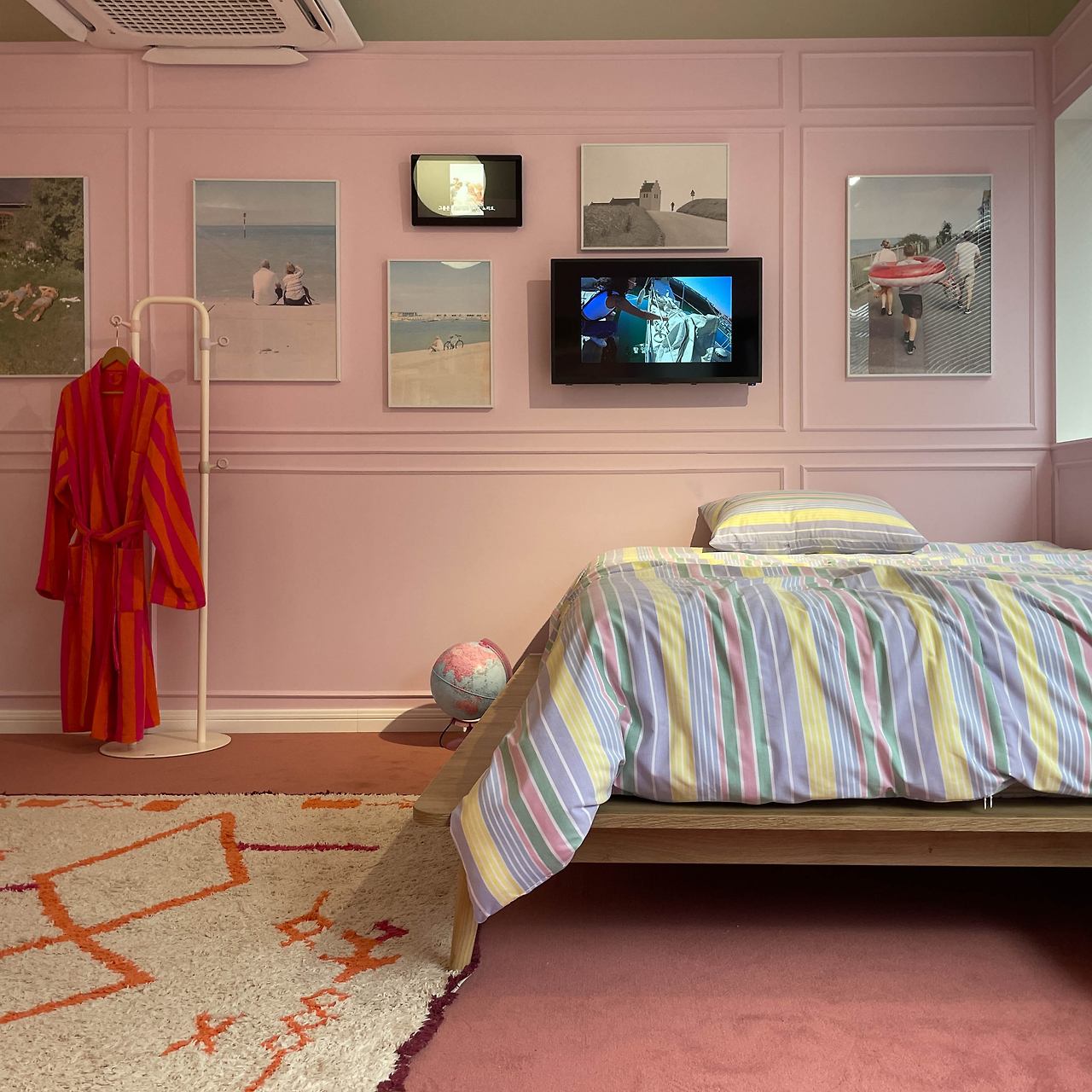 포토그래퍼 임수민의 취향을 가득 담은 세 번째 공간. 이곳은 일룸을 침실을 엿볼 수 있는 곳이다. 벽 전체를 핑크로 물들이고 사진전에 온 것처럼 사방에 그녀의 사진들이 가득하다.