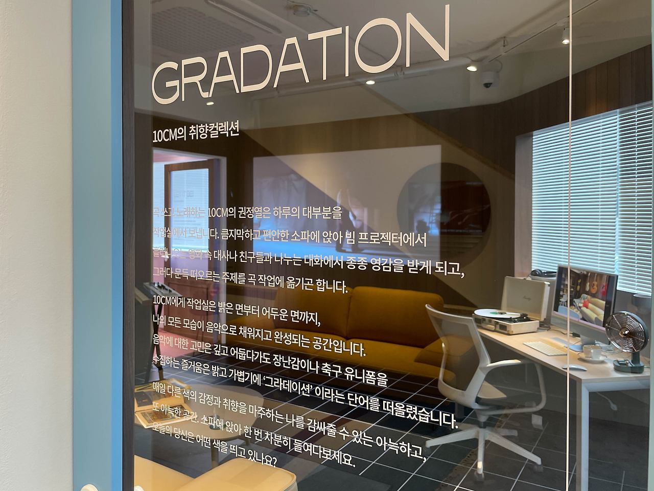 음악이라는 장르가 어두웠다가 밝아지는 다양하게 변주되기 때문에 방에도 그라데이션이라는 이름을 붙였다고 한다. 한 쪽에는 영감을 얻을 프로젝트에서 영상이 나오고, 연주를 하며 작업하는 피아노. 그리고 컴퓨터와 함께 작업할 수도 있다.