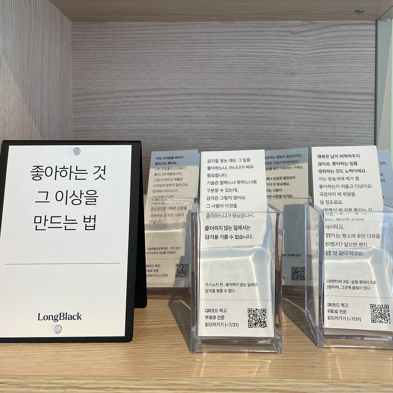 그리고 또 하나, 지식 구독 서비스 롱블랙 (@longblock.co) 구독자를 구독하고 있다면? 현장에서 롱블랙 페이지에서 구독 중인 것이 확인되면 무료 음료 쿠폰이 증정되니. 놓치지 말고 음료도 마셔보자. 층층이 나누어진 레이어드 에이드를 보며, 컨셉이 음료까지 이어지는구나 라며 또 한 번 감탄!
