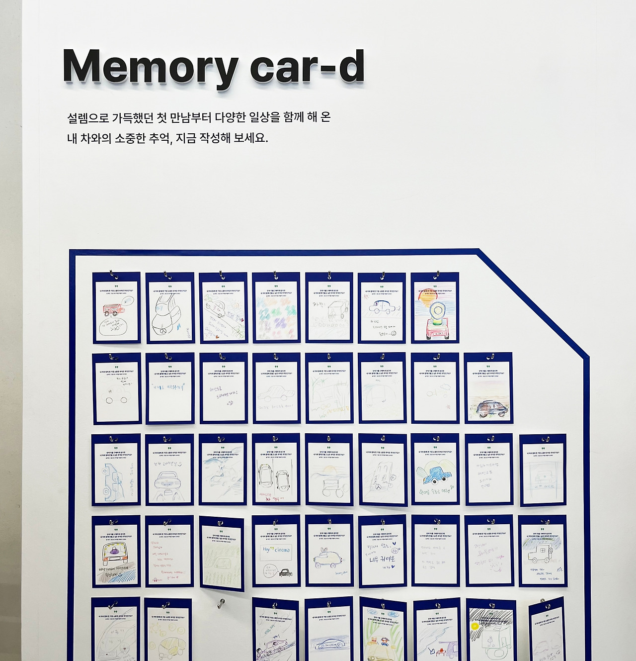 내 차와는 어떤 추억들이 있었을까? 사실 추억은 머릿속에 있지 사진에 없는 경우가 많다. 이 프로그램은 나와의 기억이 담긴 추억을 그림으로 그려보는 시간이다. 종이와 색연필로 메모리 카드에 추억의 순간을 그리면, 옆에 있는 전시회에 진열이 된다. 생각해 보니 추억이 많은데, 눈 오는 언덕길에서 헛바퀴 도는 그날이 떠올랐다. 차에게 인격체를 더하고, 함께 추억을 만들어 이렇게 그림까지 그리니 새삼 우리 차가 달라 보인다.
