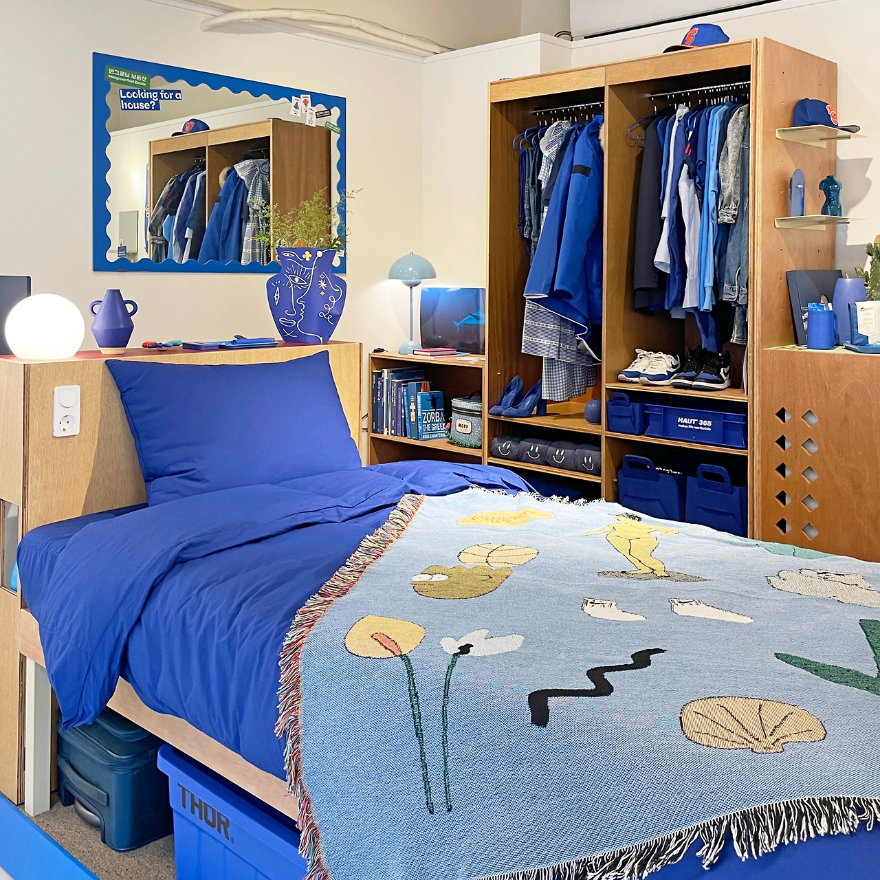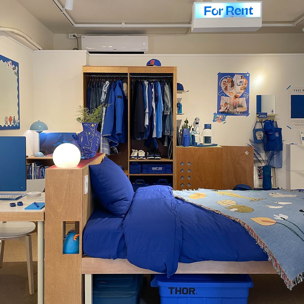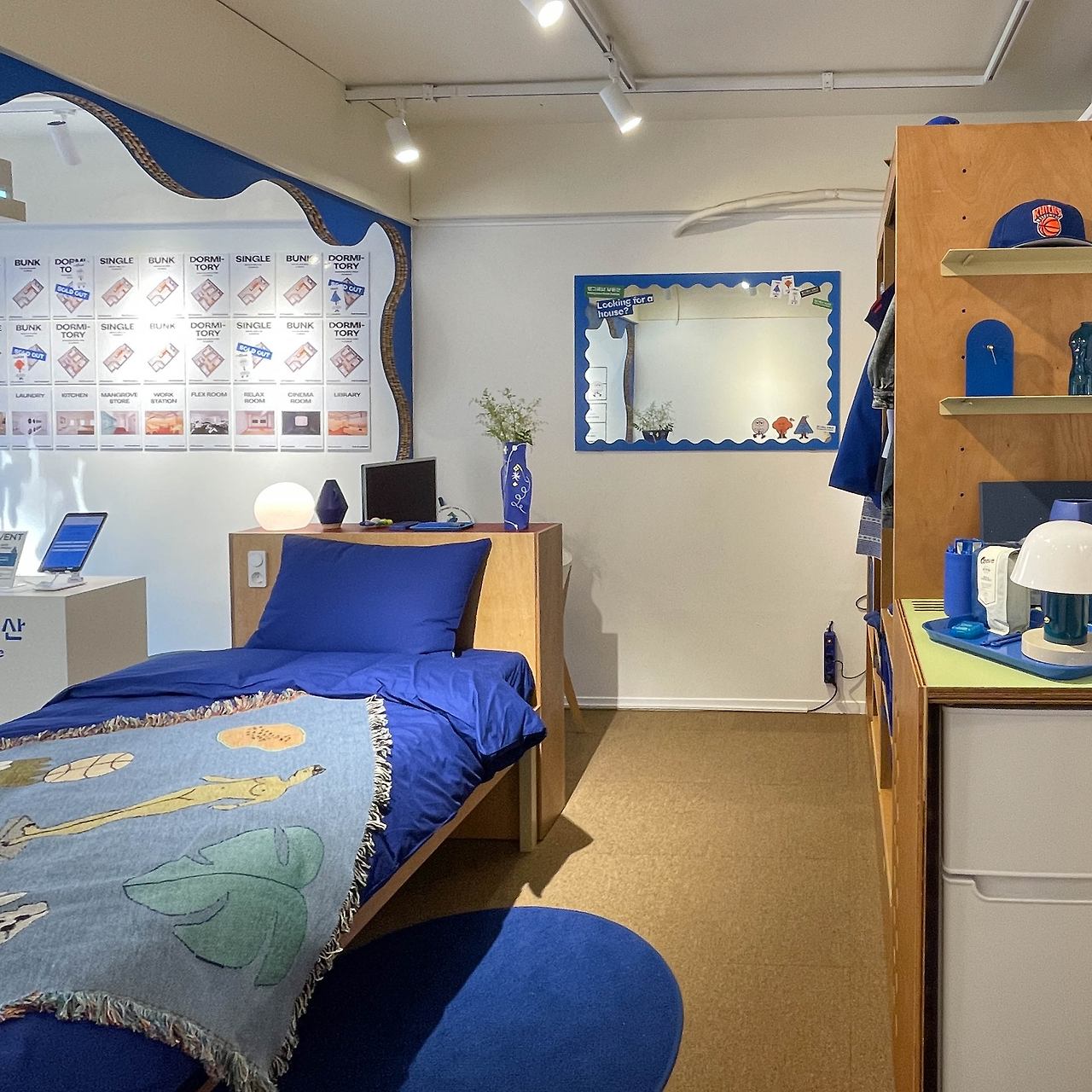팝업스토어에는 맹그로브가 실제 오픈하는 동대문의 싱글룸을 그대로 구현했다고 한다. 침대부터 책장, 선반까지. 아기자기한 소품을 더하니 완벽한 집으로 탄생. '만약에 맹그로브에 살게 된다면?' 같은 즐거운 상상을 하게 된다. 특히나 이번 팝업스토어의 시그니처 컬러인 블루 컬러로 온 방을 꾸몄더니 굉장히 감각적인 곳으로 변신! 방에 들어가 직접 활동해 보기도, 침대에 앉아볼 수도 있다.
