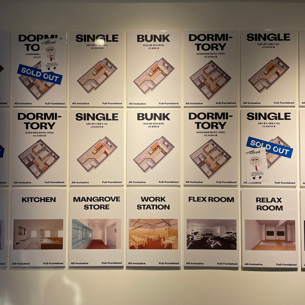 한쪽에는 맹그로브 동대문의 공간을 소개하는 이미지들이 있었는데. 팝업스토어의 모델이 되었던 싱글 타입부터 도미토리, 벙크 등 다양한 형태의 룸 타입을 한눈에 볼 수 있다. 그밖에 부엌, 작업실, 체력단련장 등 함께 사용하는 공용 시설의 모습도 보인다.