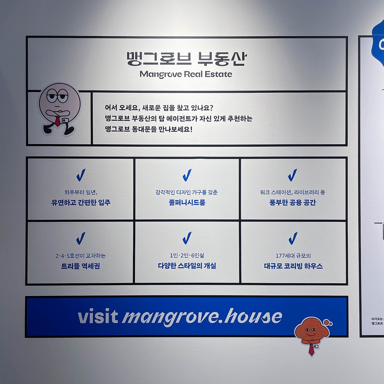 하나를 보면 열을 안다고. 작고 아담한 공간이지만, 맹그로브 동대문점을 더욱 기대하게 만드는 곳. 새로운 공간에 대한 마음이 있다면 맹그로브 부동산에서 만나보자!