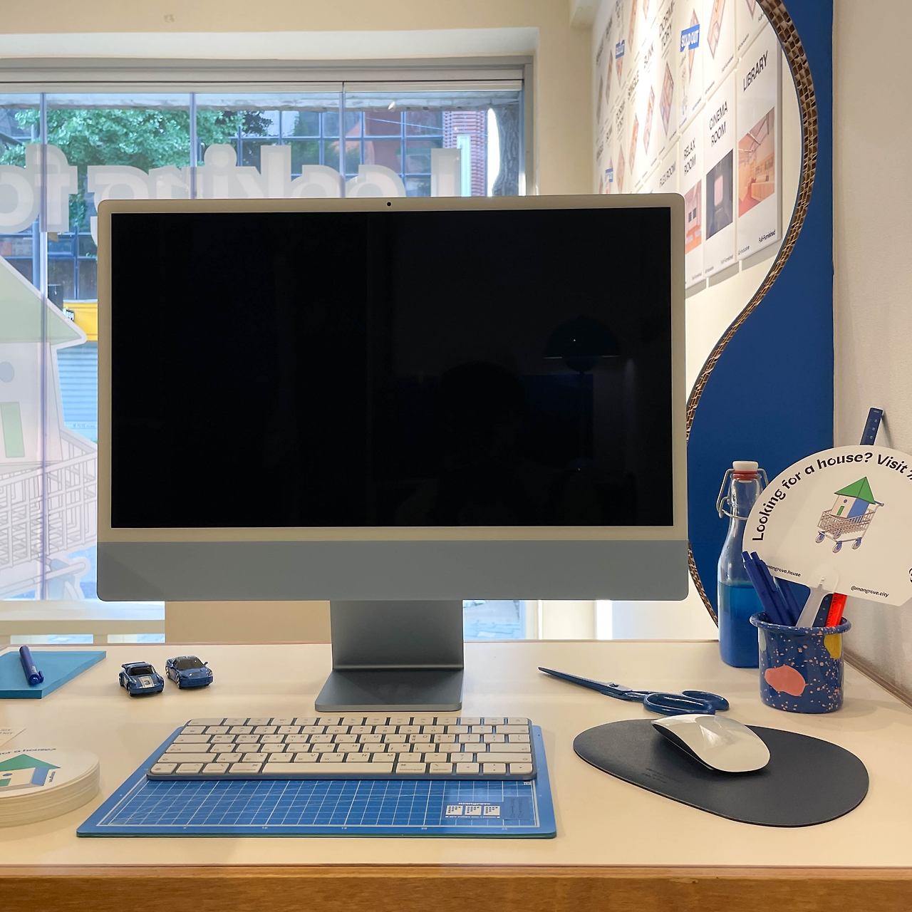 블루 톤으로 전체적인 키 컬러를 가져가다 보니 파란색 계열의 아이템이 가득하다. 그중에 하나 눈에 띄는 것은 신형 아이맥. 아무래도 20~30대의 젊은 층이 주 고객이다 보니, 그 연령대에서 인기 있는 아이템이나 가구를 사용하면 아무래도 눈이 한 번 더 가는 것은 어쩔 수 없나 보다. 아이맥도 마찬가지로 침대 옆 테이블에 밀려 있었지만, 가장 눈에 들어오는 시선 중에 하나였다.