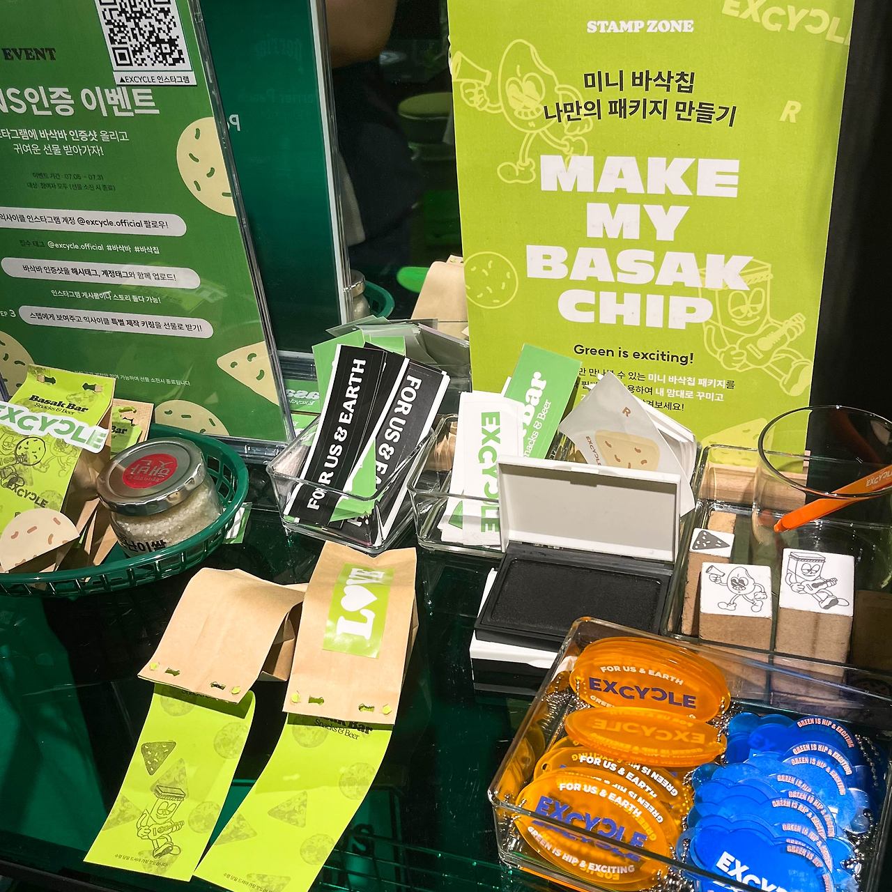 바삭칩 캐릭터가 그려진 스탬프와 스티커로 패키지를 꾸밀 수 있다. 오른쪽 아래 보이는 키링은 현장 사진을 찍어 인스타그램에 인증하면 선물로 증정한다.