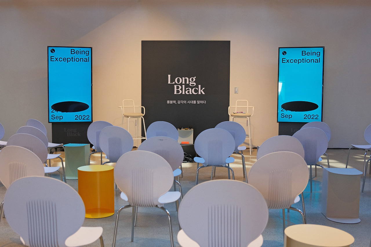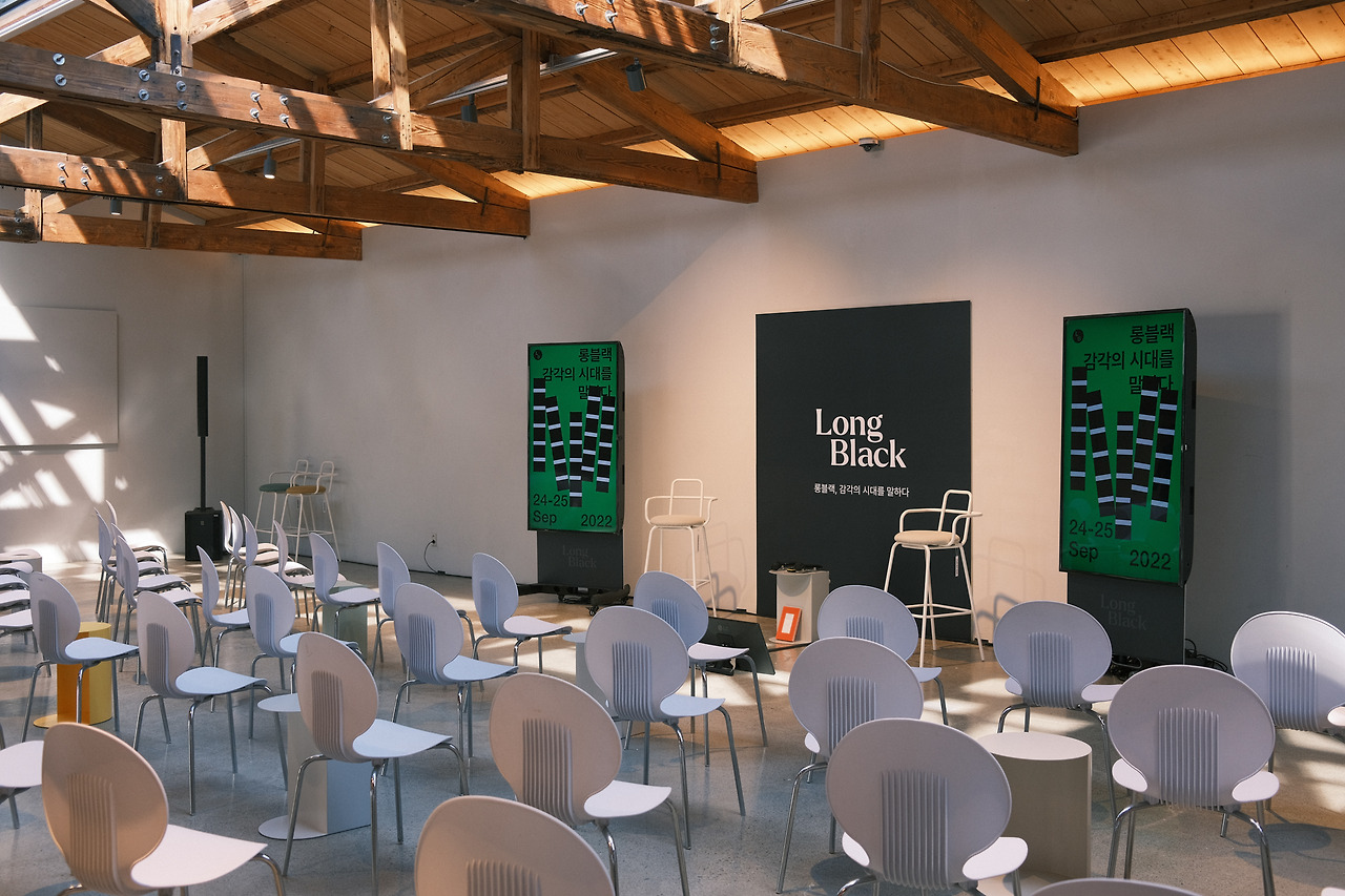 앞에서 연사들이 인터뷰를 진행하고, 한 방향으로 청중들이 바라보는 구조. 구성도 나무랄 데 없이 깔끔하다. 공간에 맞춰서 일부러 회색 의자를 선택했다면 역시 롱블랙의 센스.