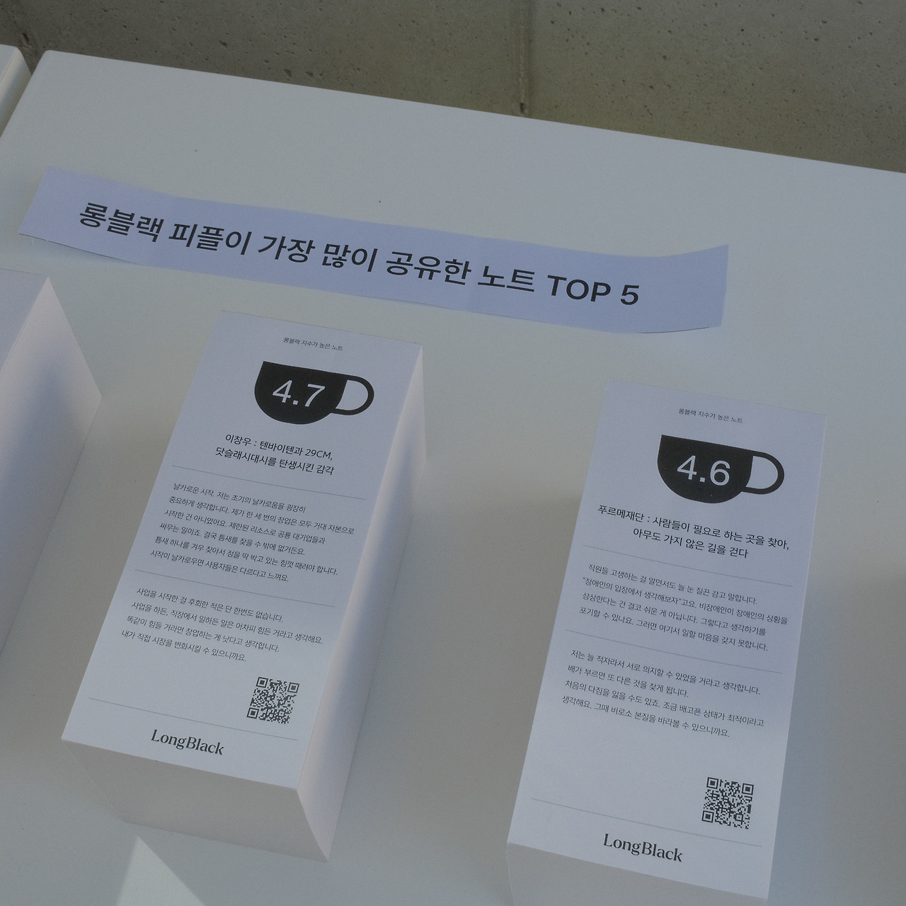 벌써 일 년. 롱블랙이 켜켜이 쌓아 올린 시간들을 오프라인 공간에서 만나는 경험은 꽤나 특별했다. 특히, 롱블랙을 준비하는 멤버들을 현장에서 오고 가며 만나는 것도 롱블랙의 실체(?)를 보는 듯해서 더 반갑기도. 더욱 애정이 가는 시간. 내일의 롱블랙이, 2주년의 모습의 롱블랙은 어떤 모습을 하고 있을지 기대해 본다.
