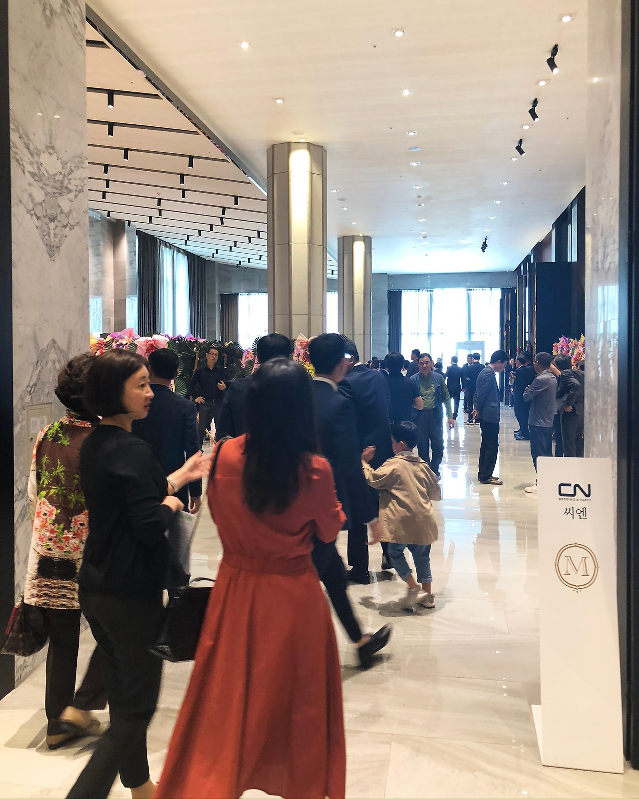 에스컬레이터를 타고 한층 올라가면 1층만큼이나 높은 층고가 나타난다. 2층에 CN 홀, 베일리 홀 2개의 식장이 있는데, 워낙 건물이 크고 동선이 멀리 떨어져 있기 때문에. 또 사진처럼 문으로 영역을 구분하고 있어서 하객이 섞이는 경우는 없다고 보면 된다. 단독홀까지는 아니지만 확실히 공간이 분리되어 좋았다.