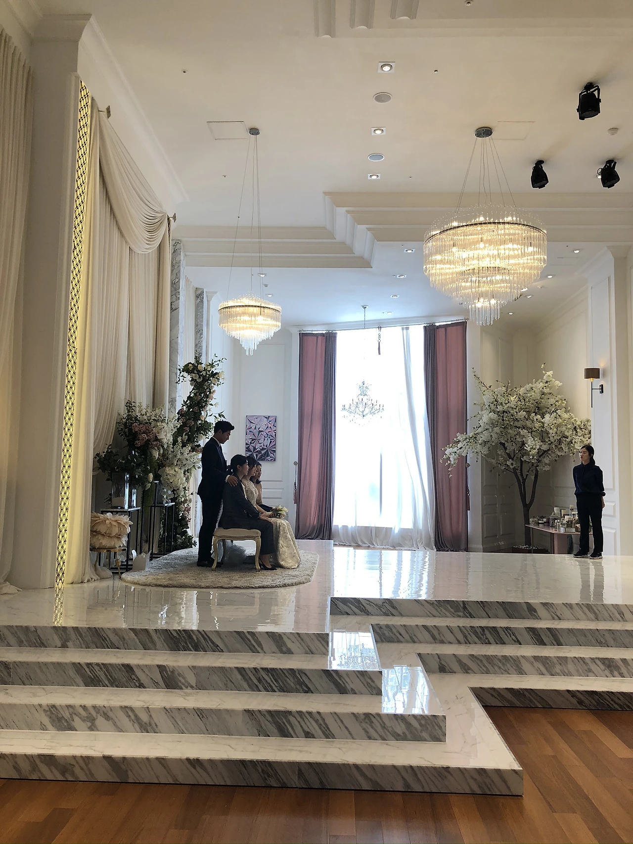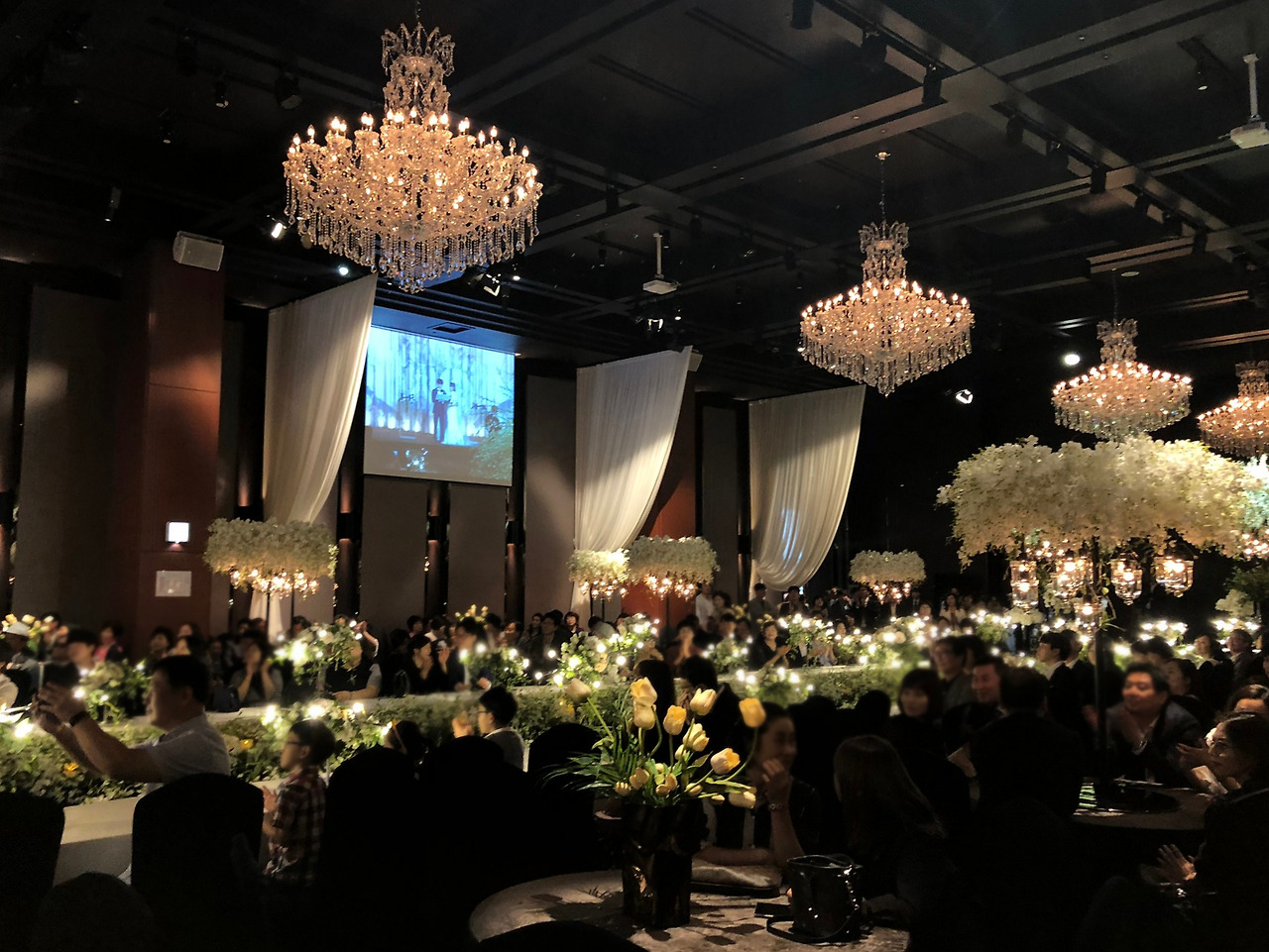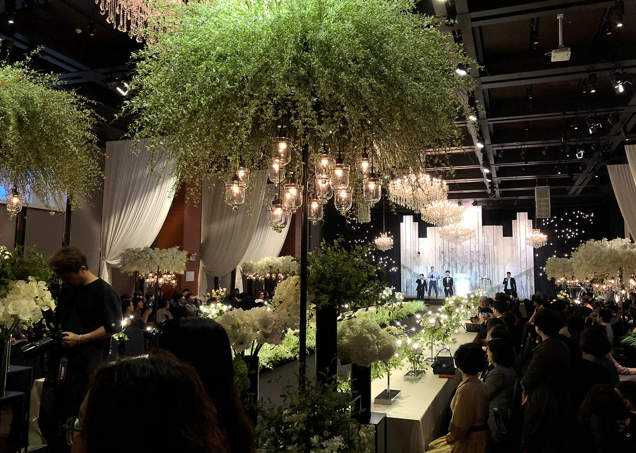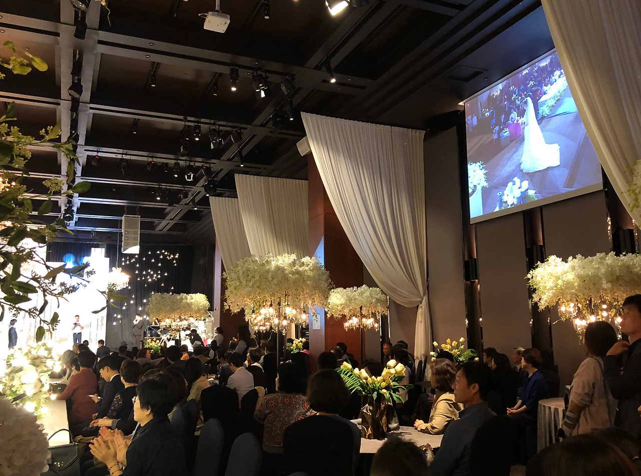 좌석은 원형 테이블로 모두 되어 있었다. 이건 사람마다 호불호가 있는데 식사를 위한 좌석이 아니라면, 공간을 넓게 넓게 쓸 수 있다는 장점이 있는 반면 예식을 바라보는 데 있어서 아무래도 뭔가 불편하다. 괜히 목이 아프기도 하고. 대부분의 고급스러운 예식은 이렇게 원형 테이블을 지향하는 추세. 어차피 이건 큰 이슈가 아니었으므로. 이것저것 살피면서 예식을 열심히 관찰하고 또 스캔했다. 어두운 가운데 집중되는 분위기며, 꽃 장식, 인테리어 모두.