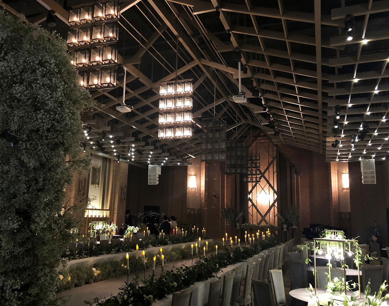 우선 1층, 채플홀이라고도 부르는 르씨엘 홀. 사진상으로 봤을 때 가장 마음에 들었던 분위기였다. 어두운 분위기 속에 조명들로 가득 채운 예식장이 인상적이었는데, 버진 로드를 중심으로 대칭하여 펼쳐져 있는 나무 구조물이 무성한 나무 숲 속 같기도 하고. 한편으로는 성당에서 결혼을 올리듯 엄숙한 분위기도 만들어 냈다. 사실 분위기만 따지면 가장 마음에 들었지만, 인원이 200명 수준의 예식장이라 아쉽게도 후보에서 제외되었다.