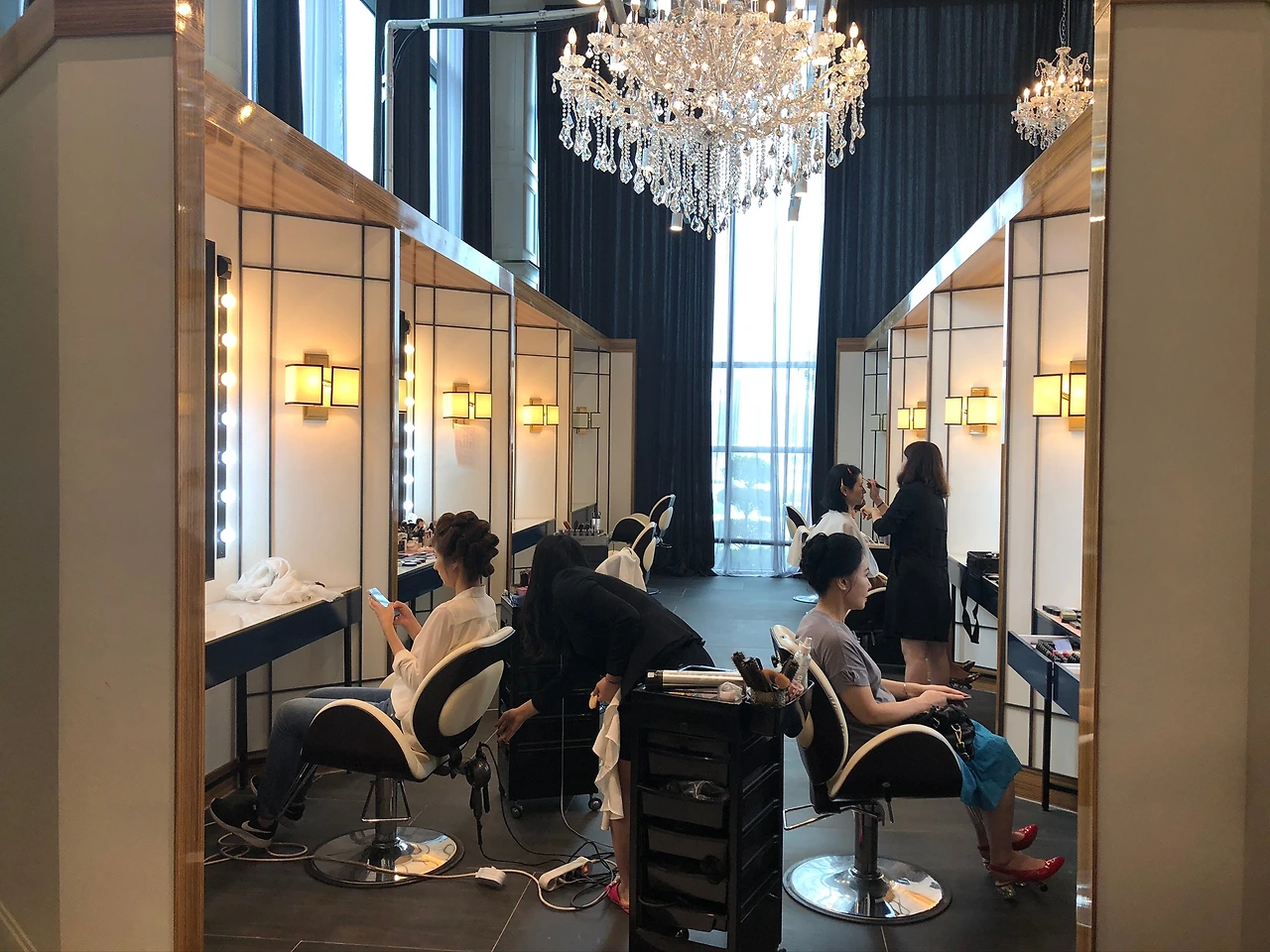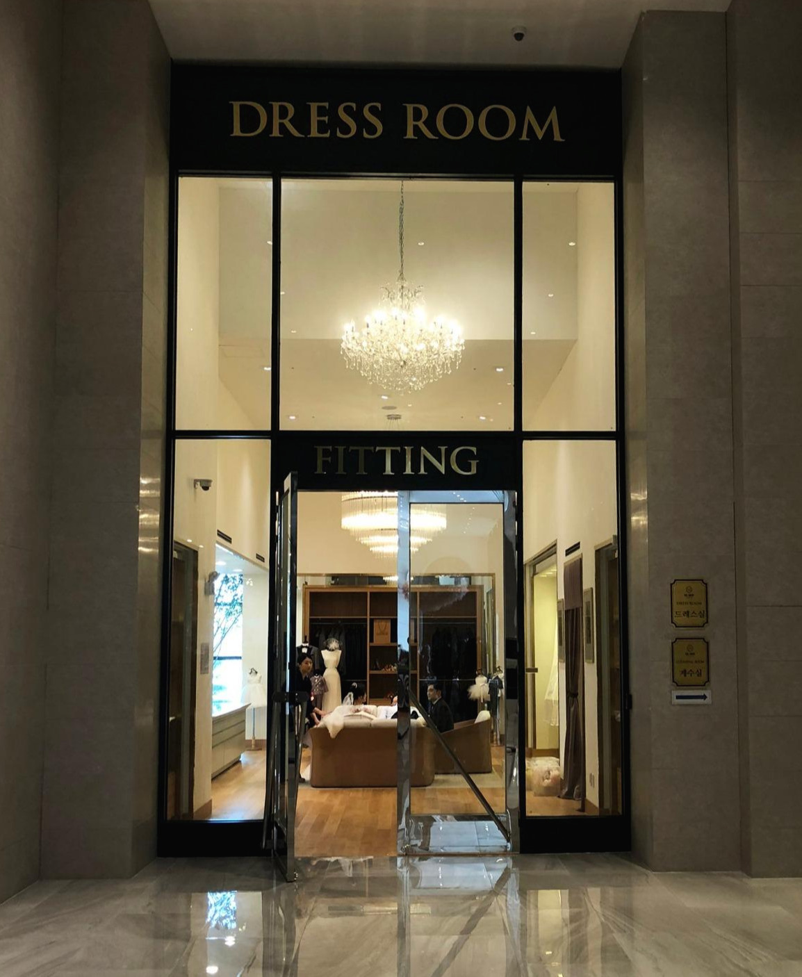 모든 홀과 식당까지 투어가 끝나고 내려오는 길에 1층의 메이크업 실과 드레스/정장 샵도 잠깐 들어가 봤다. 메이크업 샵은 스튜디오만큼이나 더 전문적으로 메이크업 테이블들이 줄지어 있었는데, 공간이 넓으니 여러 팀이 와도 붐비지 않고 사용할 수 있겠다는 생각.
