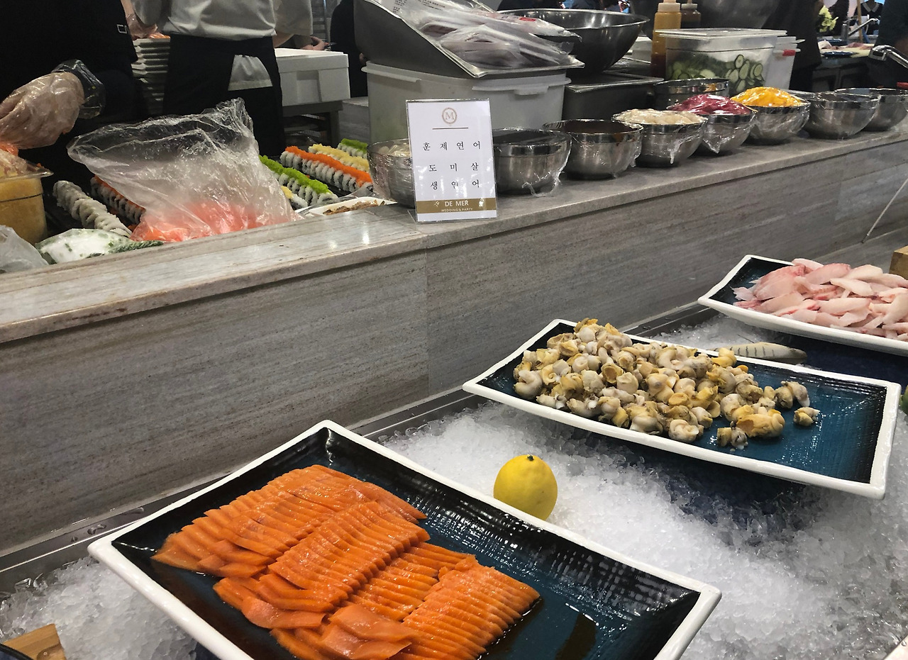 식장은 충분히 보았다. 이제 식장만큼이나 중요한 식당. 사실 부모님이 드메르를 추천한 이유가 드메르의 음식이었다. (드메르 광고 아닙니다..) 음식 가짓수도 많고 대체로 맛있다는 평이었는데. 실제로 어떠할지 기대가 되었다.