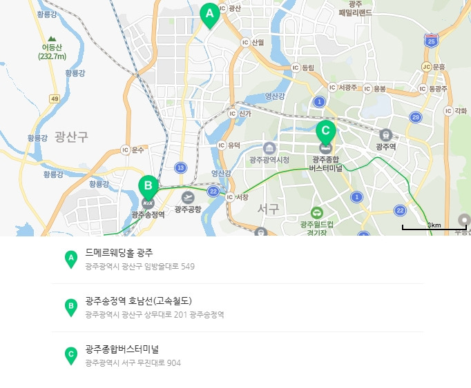 하. 지. 만. 하객들이 대절 버스만 타고 오느냐? 요즘에는 KTX를 타고도 많이 오기 때문에 기차역과의 거리도 생각해야 했다. KTX가 들어오는 광주 송정역(B)이나, 고속버스 터미널(C)이 들어오는 상무지구까지는 어느 정도 거리가 있었다. 그렇다고 대중교통이 잘 연결되어 있지도 않아서 택시를 타고 한 번 더 이동해야 하는 단점이 있었다. 물론 광주에서 오는 하객들도 가까운 거리는 아니었지만, 대부분 차를 타고 이동하기 때문에 큰 부담은 아니었고.