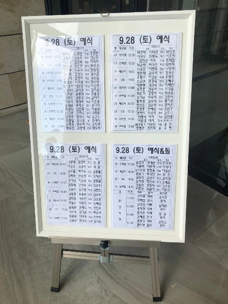 우리가 막 들어갔을 때 11시 예식이 시작을 앞두고 있어서 안내 방송 중이었다. 다시는 볼 수 없는 기회이므로 간략히 훑어만 보고 들어갔다. 아쉬운 점이라면, 앞/뒤 두 타임 축의금을 동시에 받고 있었다. 보통 그렇긴 하지만, 전 예식과 후 예식. 한 팀만 쓴다면 훨씬 더 넓은 공간을 사용할 수 있을 텐데 아쉬운 부분이었다.