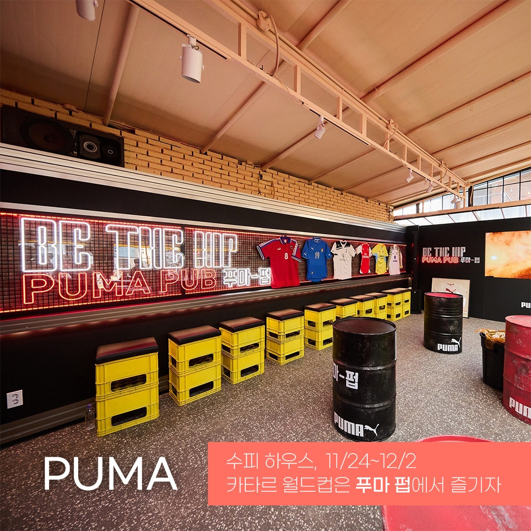 뜨거운 월드컵의 열기를 담아 푸마 펍이 오픈했습니다. 푸마의 축구 ‘Heritage’와 ‘Fun’한 즐길 거리로 가득한 푸마 펍. 푸마의 스포츠 룩과 히치한 펍이 잘 어울려요. 무엇보다 대한민국 축구 경기가 있는 날에는 단체 응원이 기다리고 있다는 사실. 푸마펍에서 시원한 맥주와 함께 월드컵을 응원해 보세요!