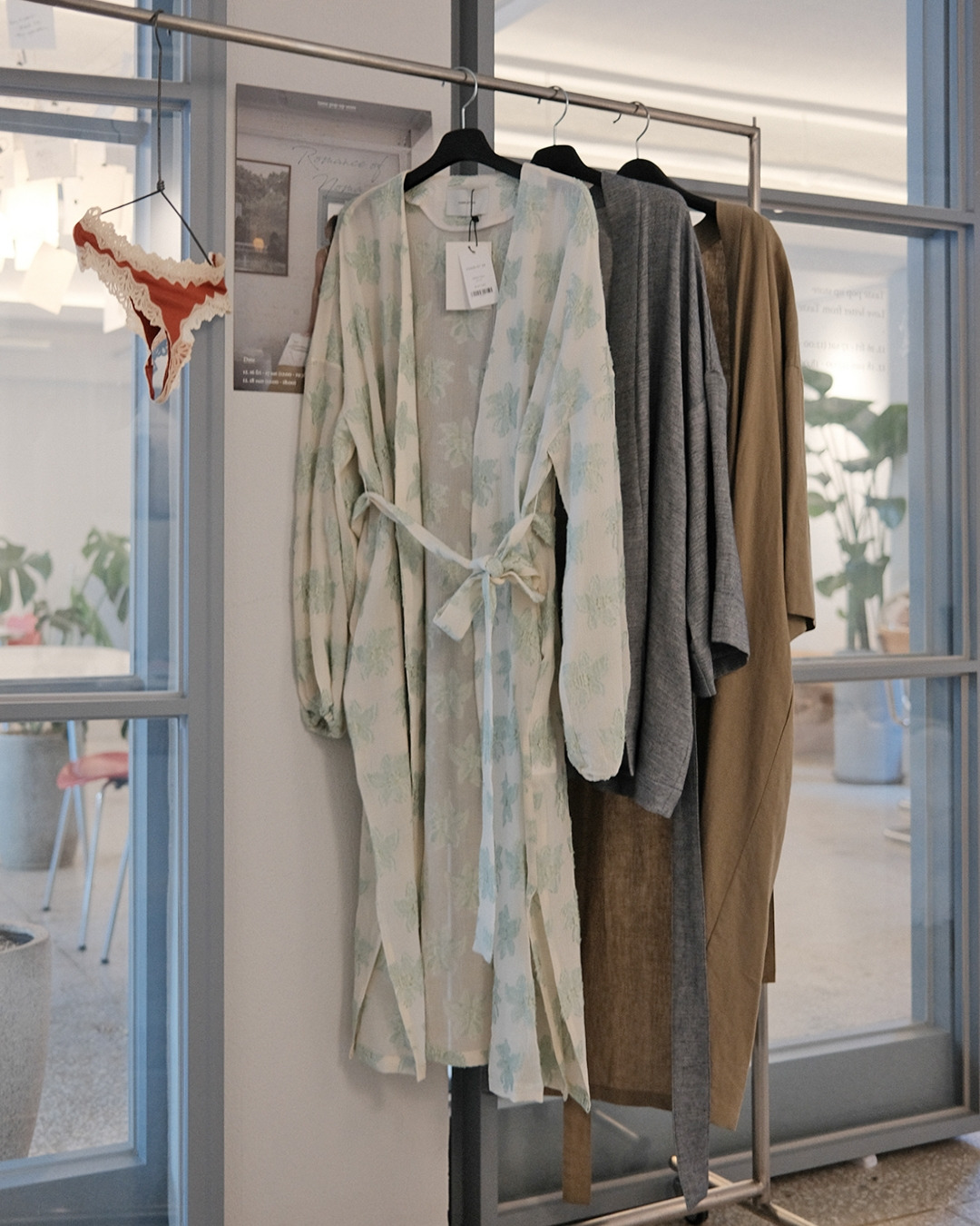 언더웨어와 밀집하게 연관된 제품 홈웨어. 로브 스타일의 제품들도 보인다. 역시 베이직한 디자인에 은은한 컬러가 포인트. 현장에서 간단하게 걸쳐볼 수 있다. 따뜻해진 공기 덕분에 금방이라도 침대에 눕고 싶을 것 같았다.