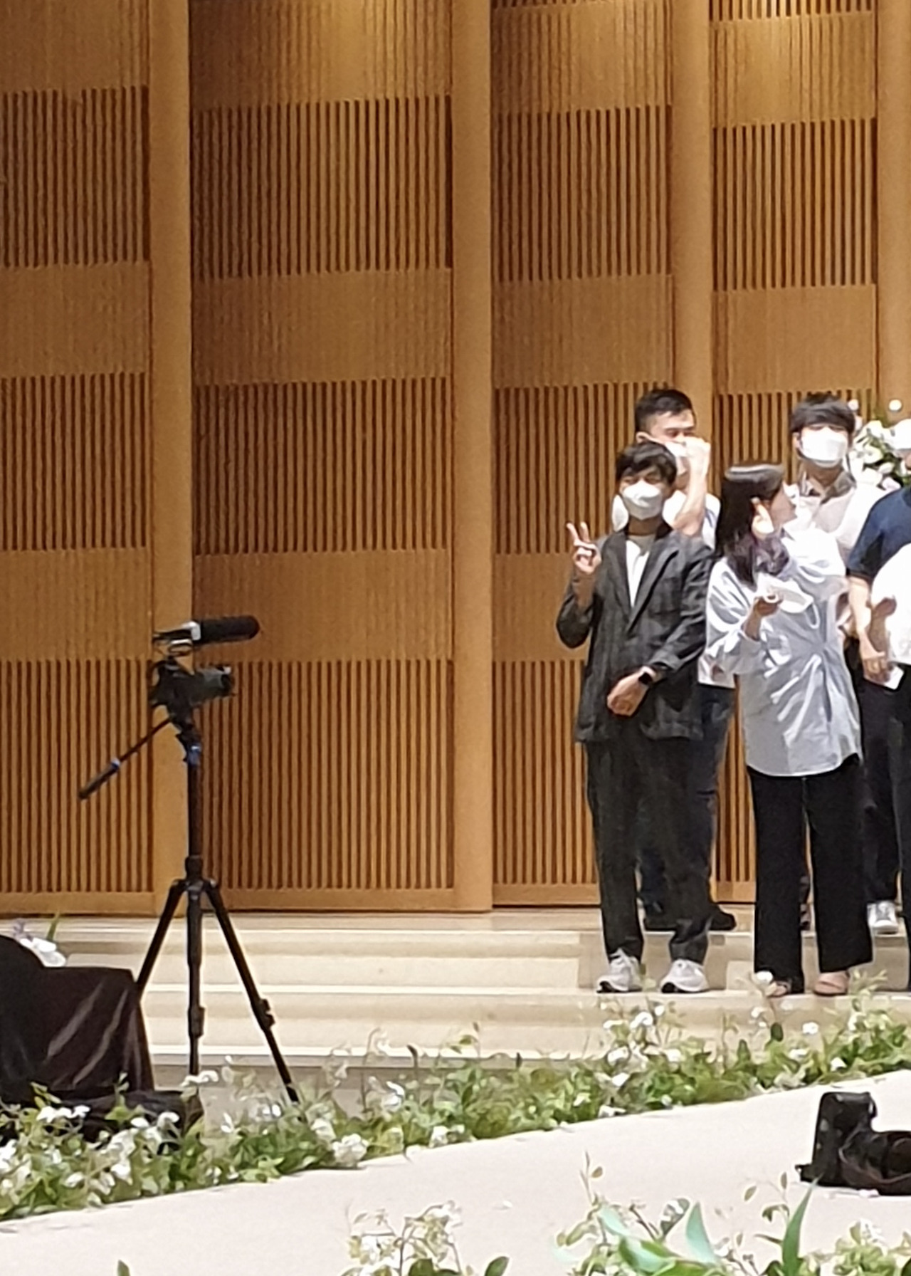 친지, 가족. 직계 가족에 이어 우리 차례가 되었다. '마스크를... 쓰고 가야 하나?' 싶었는데 아까 얼핏 들었을 때는 사진 찍을 때는 마스크 쓰고 찍으라고 한 것 같기도 하고. 막상 단상에 서니 그래도 사진을 마스크 벗고 찍어야 할 것 같아 사진 찍을 때에만 잠깐 벗고 빨리 썼다. 이것도 추억이 되길.