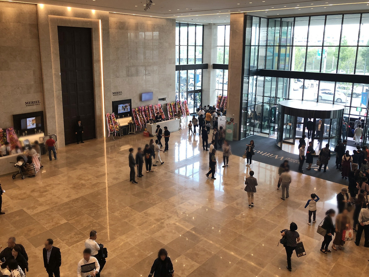 1층에 위치한 메리엘 홀. 위더스의 메인 홀로 크기가 가장 크고 넓었다. 건물에 들어서자마자 바로 큰 로비와 오른쪽에 위치한 웨딩홀 입구(왼쪽은 상담실) 가 있어 위치적 메리트도 있었다. 2층에 바로 식당이 이어져 있기 때문에 동선도 간편하고, 건물 전체를 빌린 느낌도 있다. 홀에 들어가니 마침 예식이 끝나고 사진 촬영하는 시간인듯했다. 로비에서 느꼈듯 천장이.... 무지하게 높았고. 버진 로드 또한 길게 느껴졌다. 단상과 버진 로드가 모두 베이지 톤의 대리석으로 되어 있었는데 레드 카펫과는 차별화되느 확실한 고급스러움도 느껴졌다. 호텔 결혼식 같기도 하고. 그래서인지 오늘 봤던 드메르, 라페스타와 다르게 홀이 전체적으로 밝은 느낌이다.