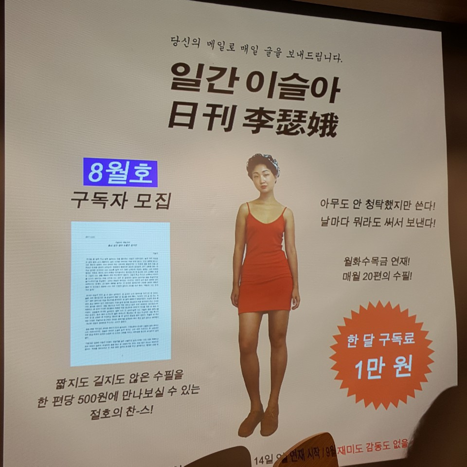 언젠가 페이스북에서 우연히 '일간 이슬아'라는 타이틀과 꽤 촌스러운, 하지만 시선을 끄는 포스터를 보았습니다. 지인들 중 누군가가 공유한 글이었어요. 그녀는 일간 이슬아를 구독하기로 했다고 했습니다.