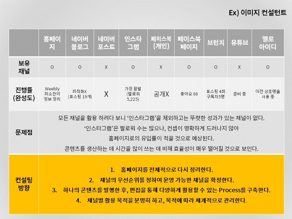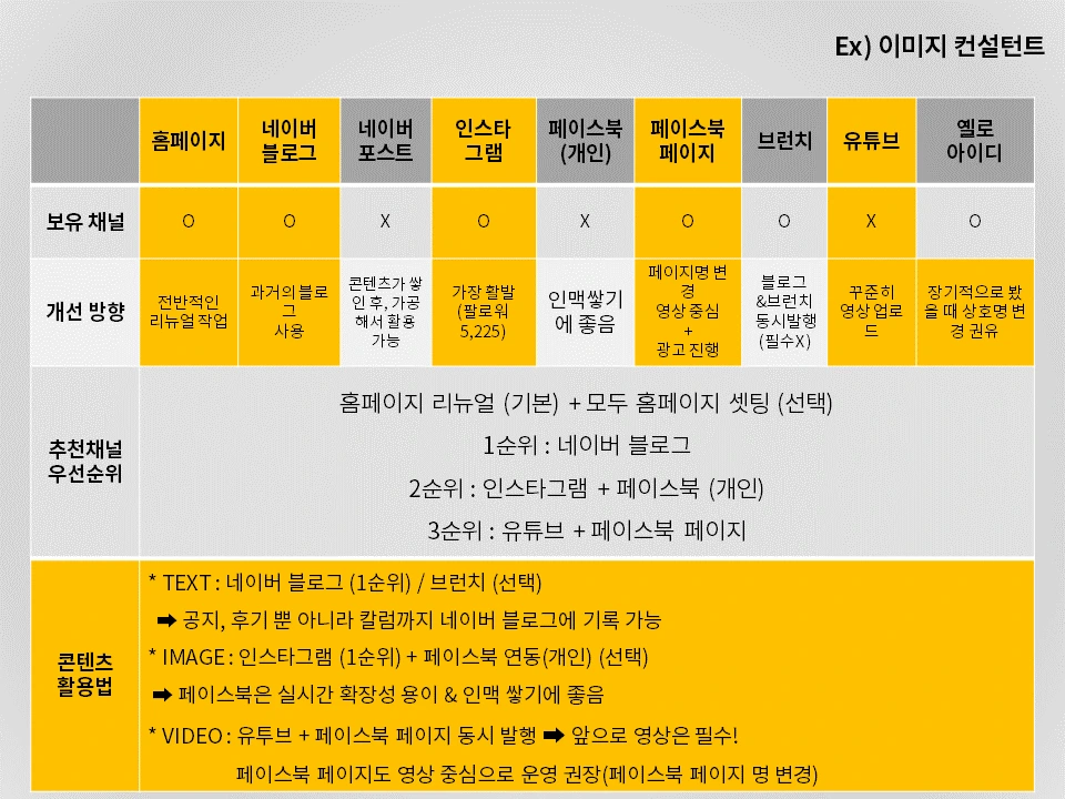 최근에 이미지 컨설턴트 한 분을 컨설팅했다. 무료 홈페이지 툴인 위블리로 홈페이지를 만들고, 네이버 블로그 및 인스타그램, 페이스북 페이지와 브런치, 옐로 아이디를 동시에 사용 중이었으며 추후에 유튜브를 하겠다고 영상 촬영을 기획하고 있었다.
