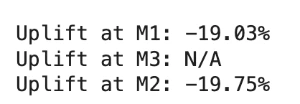 ✔️ M1 Uplift ≈ −19%, M2 Uplift ≈ −19.8% → 단기(M1)·중기(M2) 모두 의미 있는 하락이며, 초기 증가가 장기 기여로 이어지지 않음