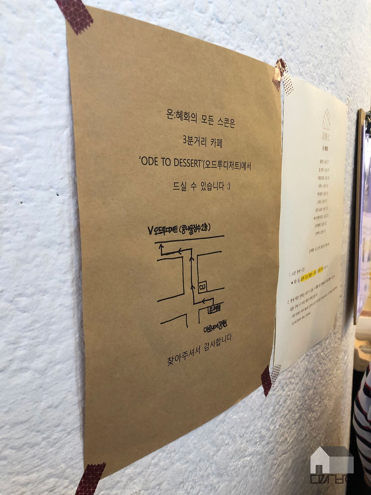 <온혜화>의 스콘은 매일 나오는 메뉴가 달라진다. 시그니처 메뉴 앙버터스콘은 매일매일 나오지만 초코칩 스콘이라던가, 말차 스콘같은 경우 어떤 날은 나오고 어떤 날은 나오지 않는다. <온혜화>자체는 공간이 작은데 만약 어딘가 앉아서 먹고 싶다면 근처 'ODE TO DESSERT(오드 투 디저트)'로 가서 먹으면 된다. 또 미리 예약하지 않고 대기가 있는 경우 한 메뉴당 2개만 구매 가능하니 주의하도록 하자!