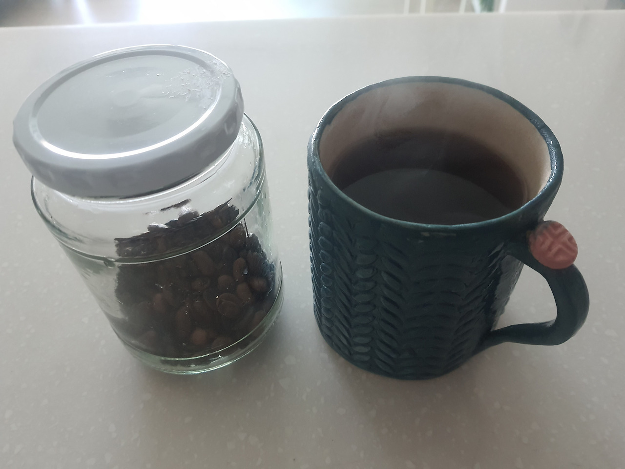 좀 전에, 로스팅해 놓은 원두를 갈아 모카포트로 추출하면서 커피 탄생의 순간도 지켜보았다.