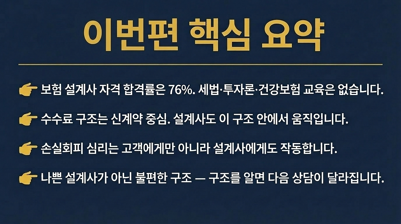 설계사를 원망하는 것보다 구조를 아는 것이 훨씬 실용적입니다. 이걸 알게 된 것 자체가 이미 대부분의 분들과 다른 출발점에 서계신 겁니다.