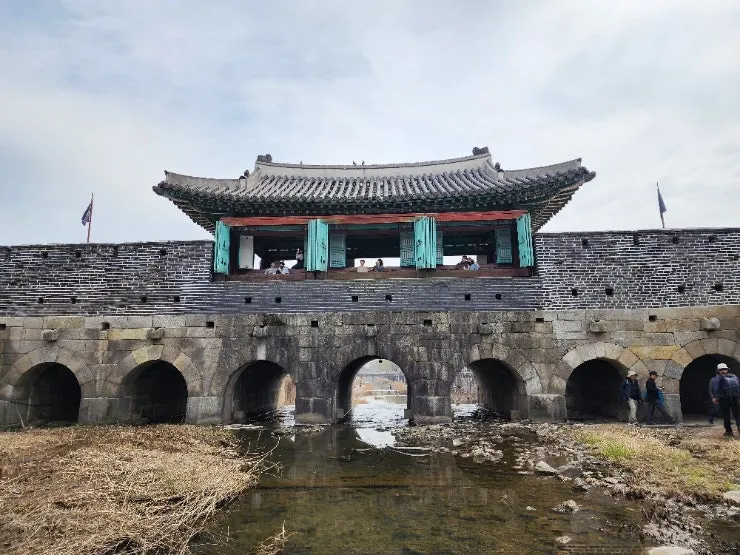 수원천이 여름에 자주 범람하자 정조대왕은 화성의 남북에 각각 수문을 만들었다. 그중 상류에 해당하는 북수문의 별칭이 바로 화홍문이다. 화홍문에는 일곱 개의 아치형 수문이 있다. 비가 많이 올 경우 수량을 조절할 수 있게 가운데 수문이 좌우의 수문보다 넓고 크다. 수문 위에 사람이 다닐 수 있도록 다리와 함께 정면 세 칸, 측면 두 칸의 단층 누각을 세웠다. 방어적 기능을 고려한 것이다. 수문은 물의 범람을 막고, 누각은 적의 침략을 막았다. 백성의 안위를 걱정했던 정조대왕의 배려가 숨어있는 곳이다.
