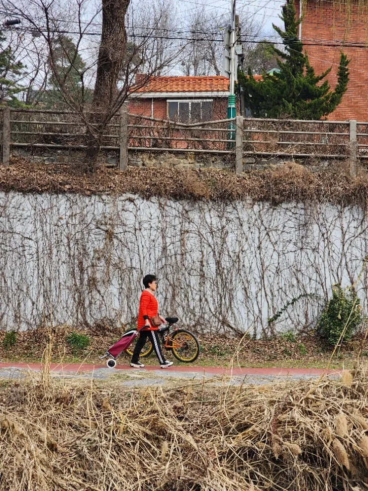 탄천길 양 옆으로 머리카락을 길게 드리운 버드나무가 화홍문과 함께 물 위에 비치는 풍경은 언제 보아도 운치 있다. 방화수류정과 용연을 둘러보고 화홍문 아래 탄천으로 내려와 물길을 따라 걷는다. 물 흐르는 소리와 봄의 기운이 어우러져 내 귀에는 청아한 음악소리로 들린다. 수원천을 따라 바퀴 달린 장바구니를 끌며 시장을 향해 활기차게 걸어가는 아주머니가 보인다. 운동 기구에 한쪽 다리를 올리고 열심히 운동하는 할아버지도 보인다. 성곽을 울타리 삼아 살고 있는 성안 사람들의 안온한 일상이 흐른다. 평화롭고 정겨운 봄날의 풍경이다.