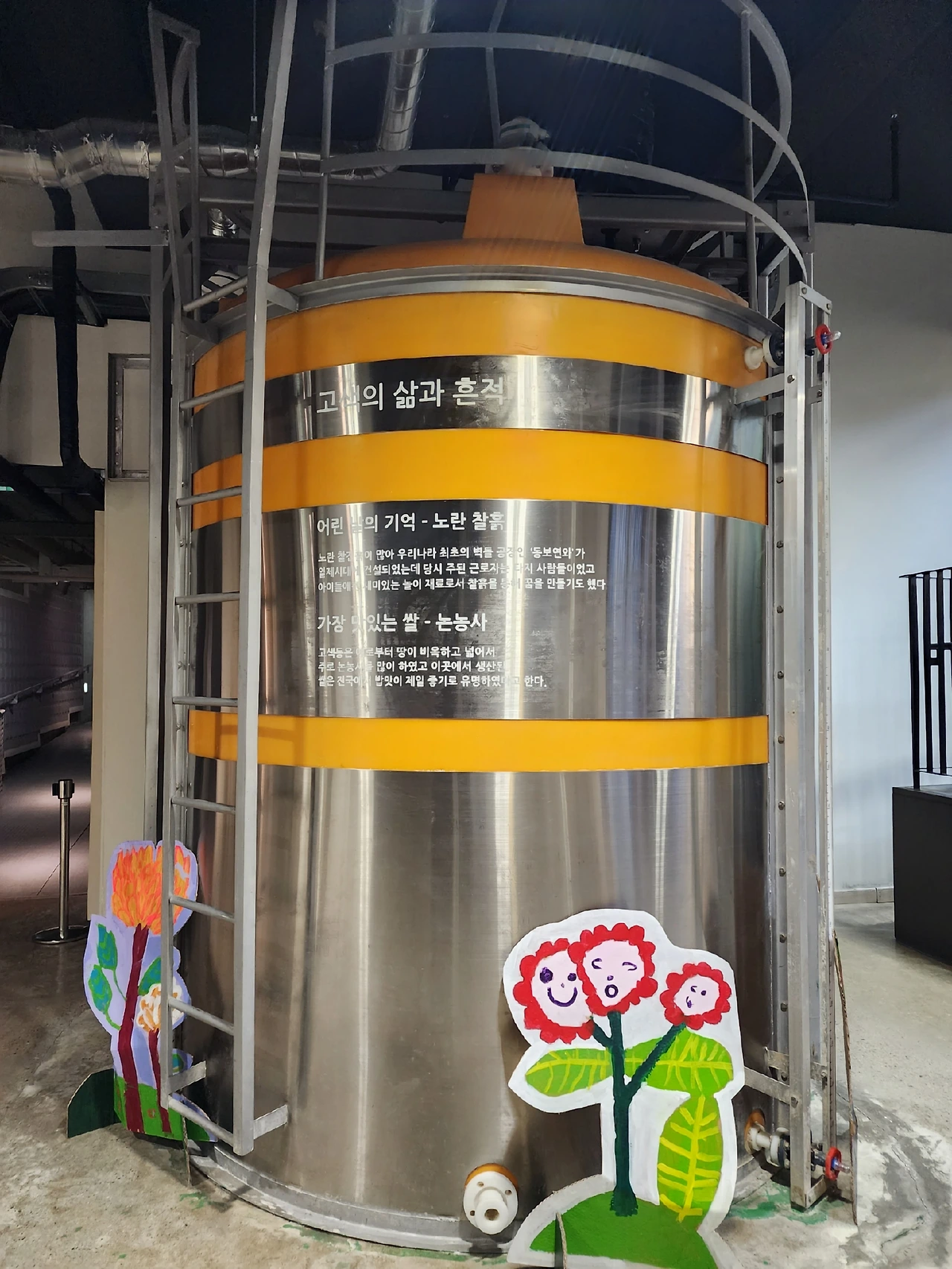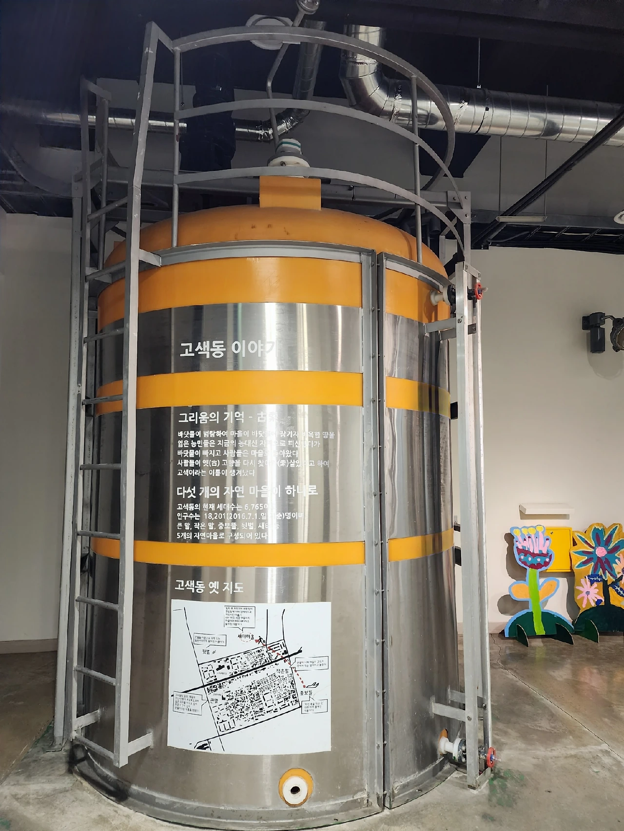 한쪽에는 세월의 밀봉을 뚫고 나와 눈이 부신 듯 한 번도 사용하지 못한 두 개의 폐수 처리용 약품 탱크가 빛나고 있다. ‘고색동 이야기’라 적힌 탱크에는 지명의 유래와 옛 지도가, ‘고색의 삶과 흔적’이라 적힌 탱크에는 고색동의 찰흙과 쌀에 대한 이야기가 기록되어 있다. 십 년의 적막함이 가득 담긴 두 대의 폐수 처리 탱크를 보면서 상상했다. "우리는 쓸모 없어진 존재가 아니라 이 자리를 지키며 묵묵히 고색의 역사를 알리는 중이야." 서로에게 위로의 말을 건네는 풍경을.