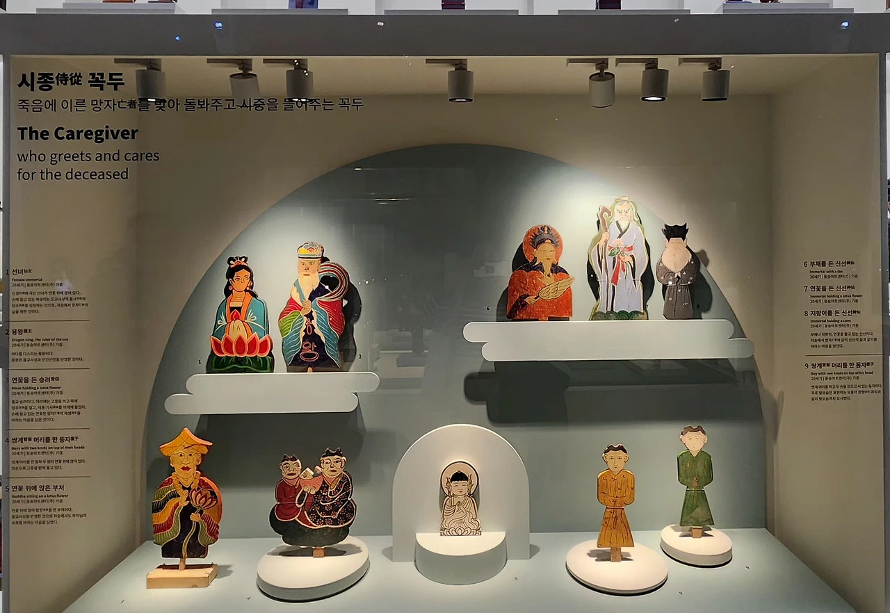 전시된 꼭두는 죽음에 이른 망자를 맞아 돌봐주고 시중을 들어주는 시종 꼭두, 망자를 즐겁게 하려 악기를 연주하고 재주를 부리는 광대와 악동 꼭두, 망자를 저승으로 안내하고 위협으로부터 지켜주는 호위 꼭두 등이 있습니다.