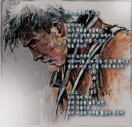 하긴 화재 사고로 위험에 빠진 인명을 구하려다 순직한 젊은 소방관 이야기를 들은 지도 얼마 안 됐었다. 작년 말에 제주도 서귀포의 감귤 창고에 발생한 화재로 주택에 있는 80대 노부부를 대피시킨 후 불을 끄다가 순직한 젊은 소방관이 있었다. 누군가를 구하느라 젊은 생명이 사라지는 일은 가슴이 더 많이 아팠다.