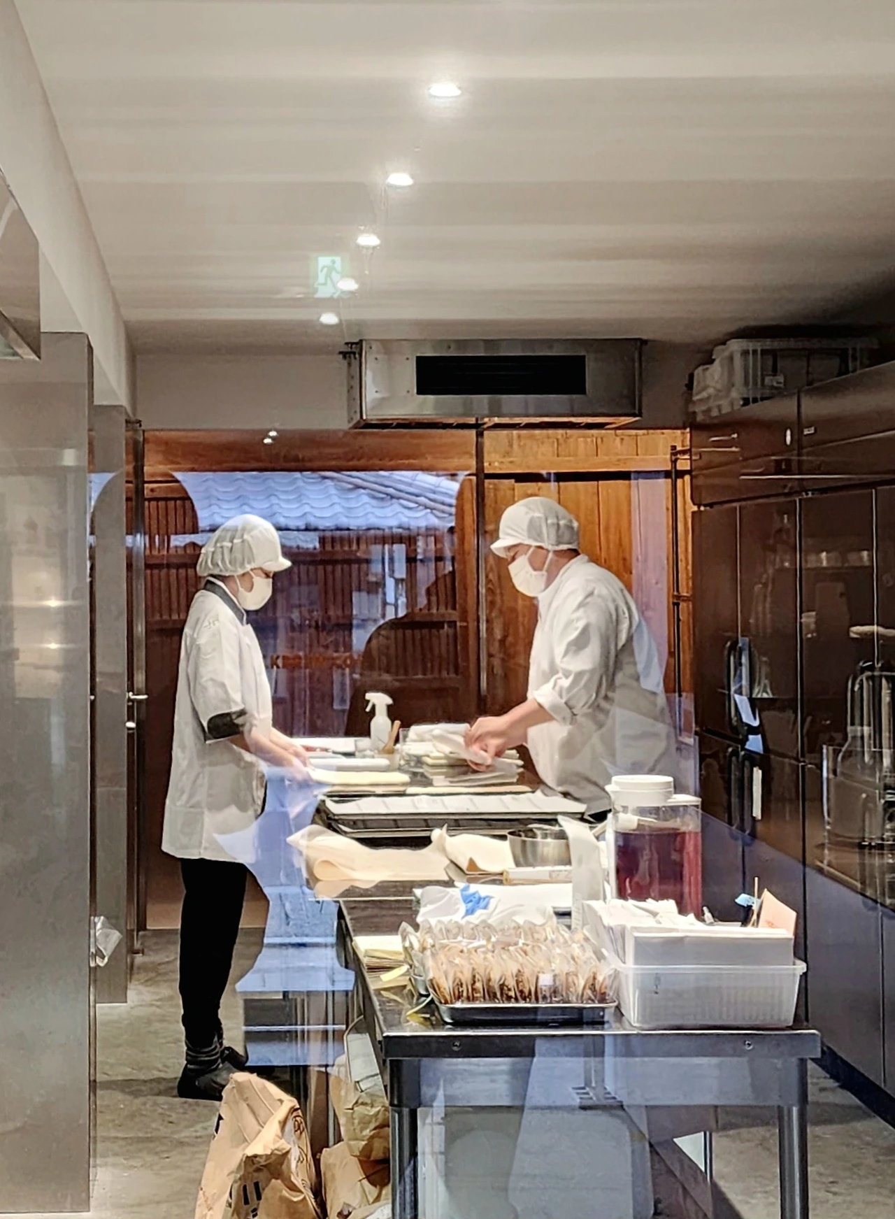 실내의 유리막 너머 작업실에서 에도시대 분위기의 나무 벽을 배경으로 직원들이 빵을 만들고 있었다. 시대는 변해가도 장인 정신은 그대로 물려받은 듯이 진지하고 경건하게 반죽을 한다. 밖에는 진눈깨비가 내리고 있는데 하얀 밀가루 반죽을 만지는 모습은 아늑하고 고요했다. 빵 반죽처럼 폭신하게 부푼 마음으로 한참을 서서 바라보았다.