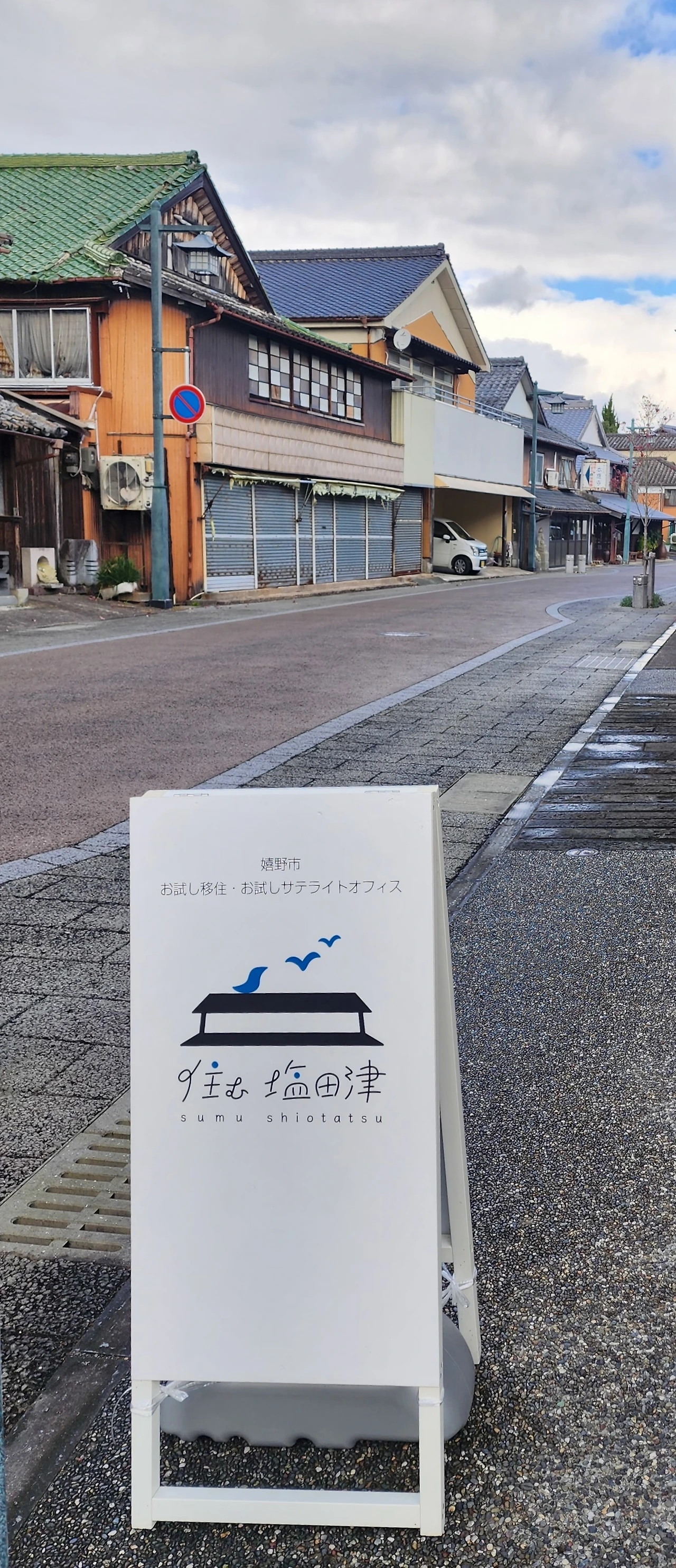 에도시대에 쌀가게였다는 안내판이 붙은 가옥이나 기념품 가게가 보인다. 보존 건물 사이로 현대적인 간판과 인테리어로 꾸민 카페와 식당 등이 섞여 있었다. 옛 가옥의 지붕 위로 파랑새가 날아가는 모양의 입간판이 눈에 띄었다. 단순하면서도 시오타츠를 상징할 수 있는 개성 있는 디자인으로 보인다.
