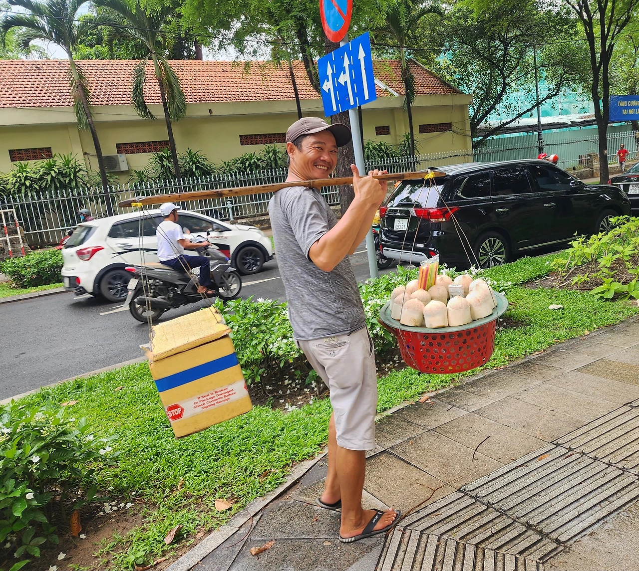 시내에 있는 벤탄시장을 찾아가다가 코코넛 주스를 파는 남자를 만났다. 한쪽에는 노란 스티로폼 상자를, 한쪽에는 코코넛 열매를 수북이 쌓은 빨강 바구니를 매단 지게를 어깨에 메고 있었다. 도심에서 지게를 맨 사람을 보다니, 낯설면서도 반가운 풍경이었다. 사진을 찍고 싶어 휴대폰을 들이대니 엄지를 척 올리며 미소까지 지어주었다. 사진만 찍고 얼른 지나려는데 갑자기 그가 코코넛 주스를 건넸다. ‘이건 또 무슨 친절이지?’ 잠깐 어리둥절했다. 괜찮다며 손사래를 치는데도 그는 칼로 코코넛의 꼭지를 도려내고 다정하게 빨대까지 꽂아 권했다. 나는 할 수 없이 지갑을 열었다. 사기도 아니고 애교스러운 강매를 당한 것이다. 당하는 기분이 나쁘진 않아 빙그레 웃으며 코코넛 주스를 들고 돌아섰다.