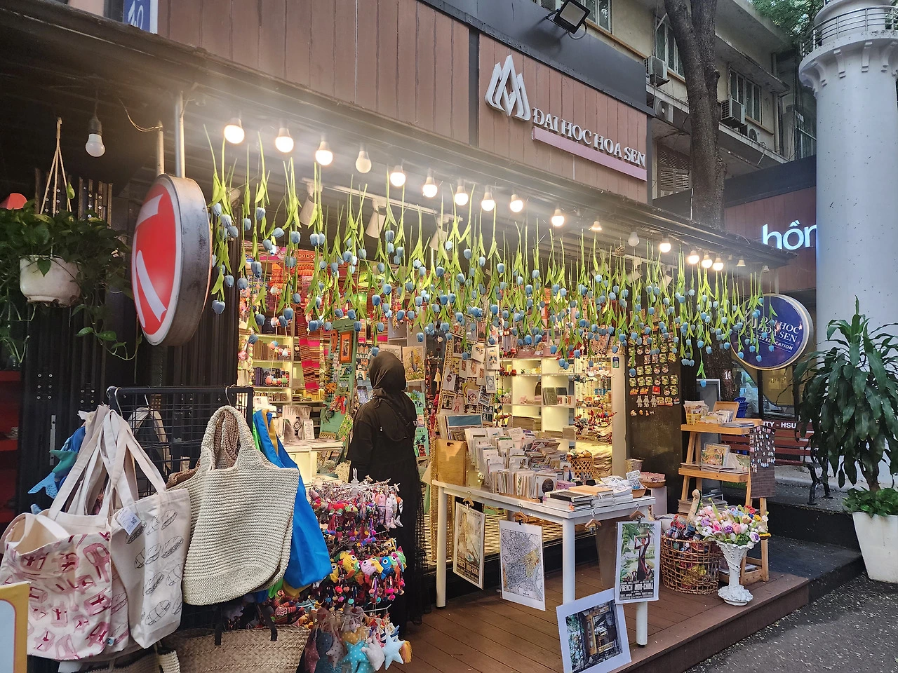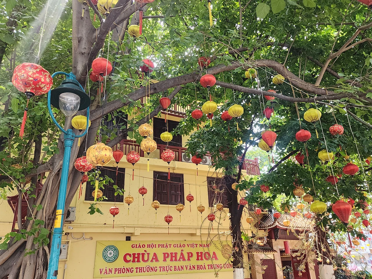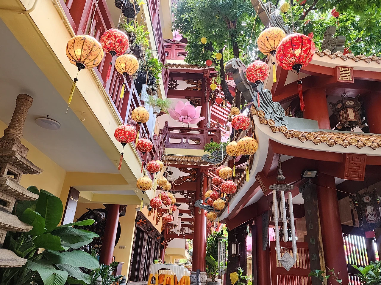 오토바이가 세워진 보도 사이로 아슬아슬하게 걸어가 첨탑이 있는 Phap Hoa Pagoda 불교 사원을 찾아냈다. 안에서 경을 읽는지 마이크 소리가 크게 들려왔다. 사원 앞 큰 나무에 남자 두 명이 올라가서 가지마다 꽃등을 매달고 있었다. 걸어오며 보았던 그들의 일상은 소박했지만, 사원은 무척이나 화려하게 꾸며놓았다. 주황색 지붕에 층층이 붉은색 옻칠을 한 난간에 만개한 분홍색 연꽃을 걸어 혼례를 앞둔 새색시처럼 화사했다. 사원에서 기도를 올리는 사람들을 오래 바라보았다. 가족, 친구, 어디서든 서로의 안녕을 빌어주느라 오가는 길에 흔하게 사원이 있는 거겠지. 현지인의 일상에 숨어있는 마음을 엿보려 애쓰던 산책이었다.