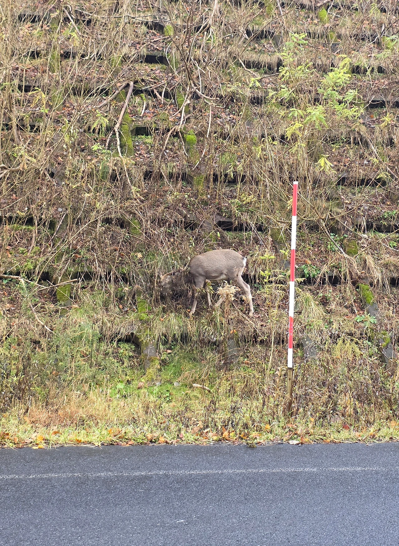 도로까지 내려온 사슴과 눈이 마주쳤을 때