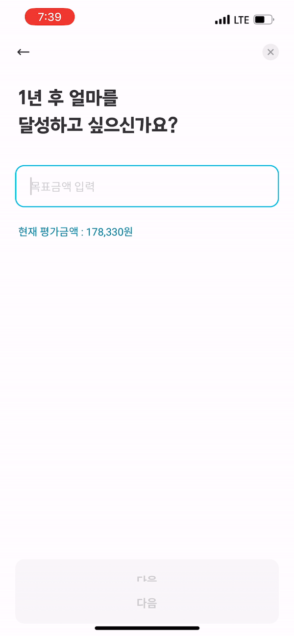 목표 금액 입력을 시작하고 나면 숫자 뒤에 ‘만원’이라는 단위가 나타나는데, 입력 전 Placeholder에는 단위가 표시되어있지 않다. 입력을 시작한 순간부터는 이미 숫자를 얼마나 입력할지에 집중하고 있기 때문에 단위를 빠르게 알아차리기 어려웠다.