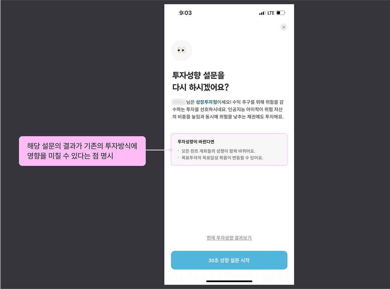 또한, 만약 기존에 투자성향 설문을 완료한 경험이 있다면 테스트 전 아래와 같은 화면을 먼저 보여줌으로써 해당 설문의 결과가 아이작의 투자운용방식에 영향을 미칠 수 있다는 점을 미리 안내해 준다.