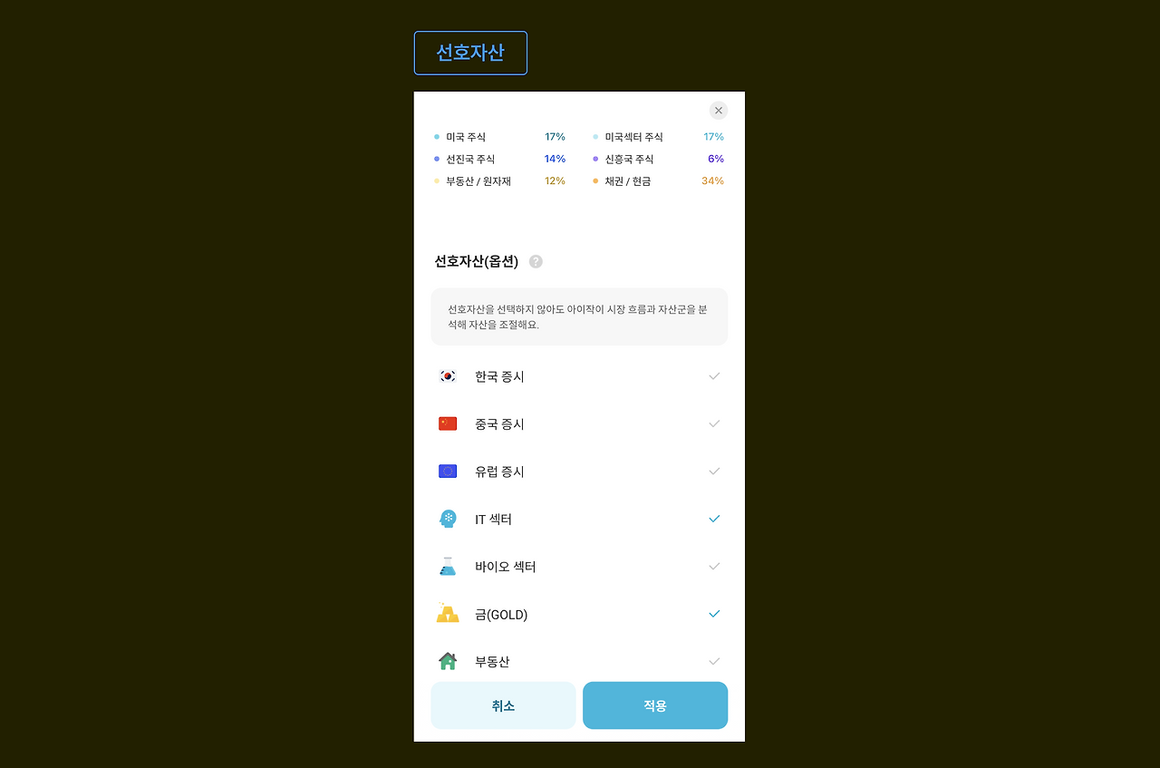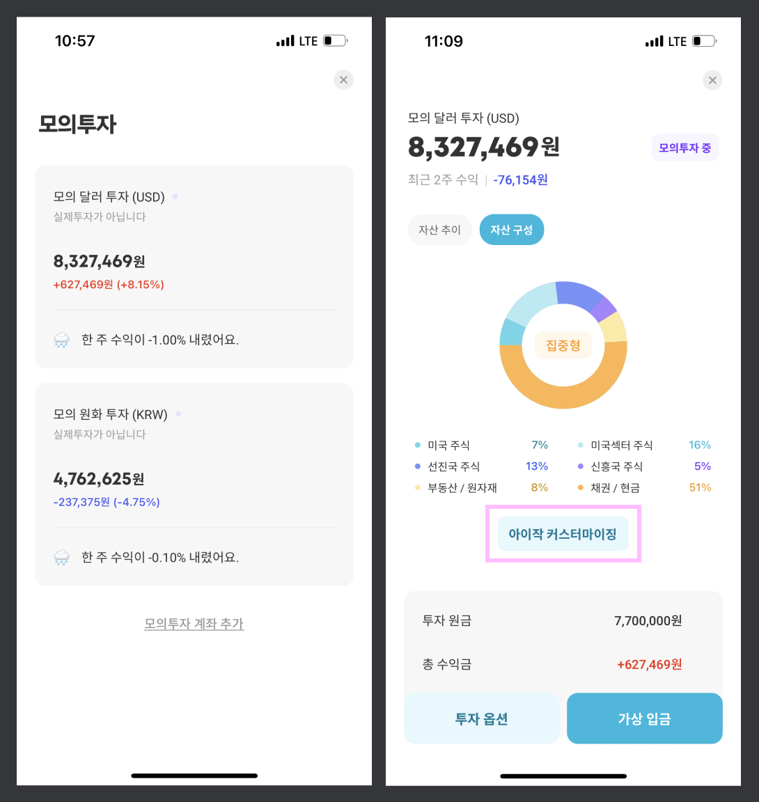 모의투자에서도 실제 투자할 때와 마찬가지로 나의 투자성향이 반영된 자동 포트폴리오를 기반으로 아이작 커스터마이징이 가능하다.
