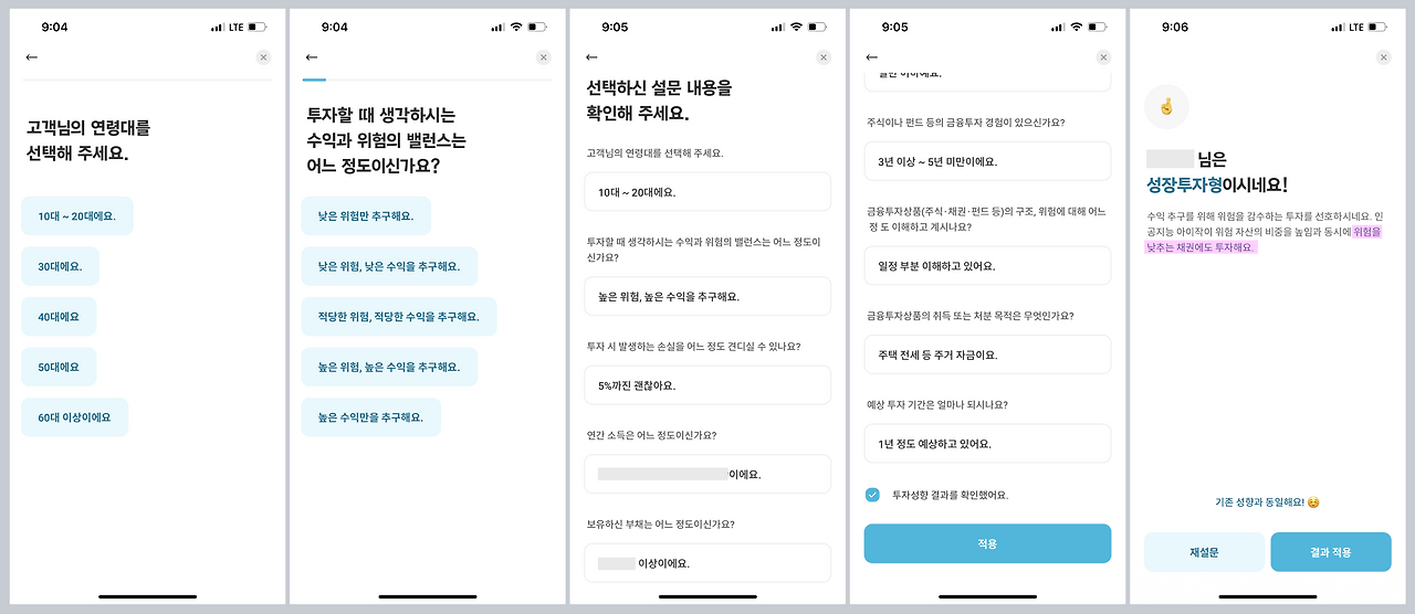1. 투자 방식에 적용하거나(결과 적용), 2. 설문을 다시 하거나, 3. 설문만 하고 창을 닫을 수도 있다.