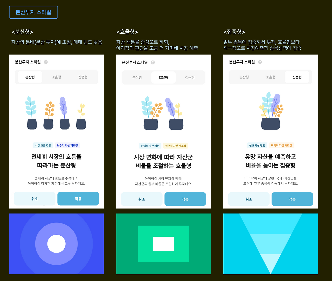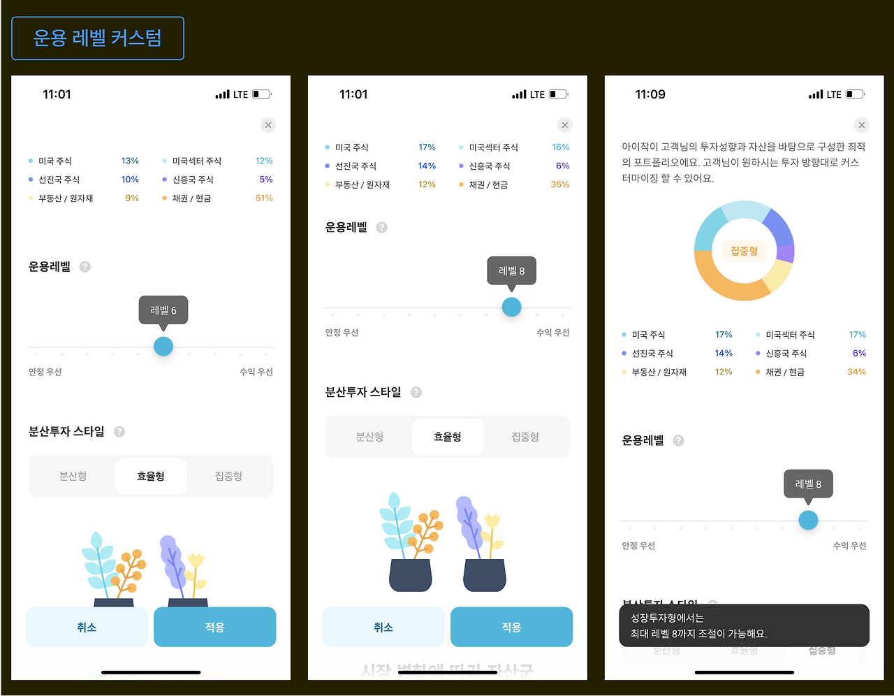 운용레벨뿐만 아니라 분산 투자 스타일과 선호자산 또한 설정 가능하다.