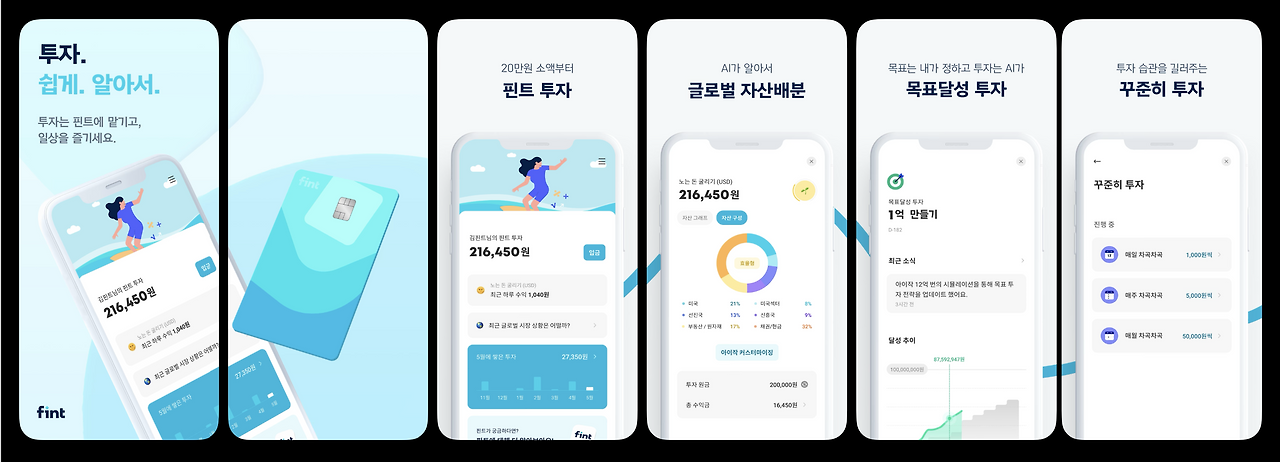 스크린샷 첫 장에서도 확인할 수 있듯이 핀트는 ‘쉽게’, ‘AI가 알아서’, ‘맡기고’, ‘일상을 즐기세요.’ 등의 워딩들을 통해 생활 속에서 자산을 쌓아가는 간편 투자 플랫폼임을 어필하고 있다.